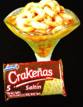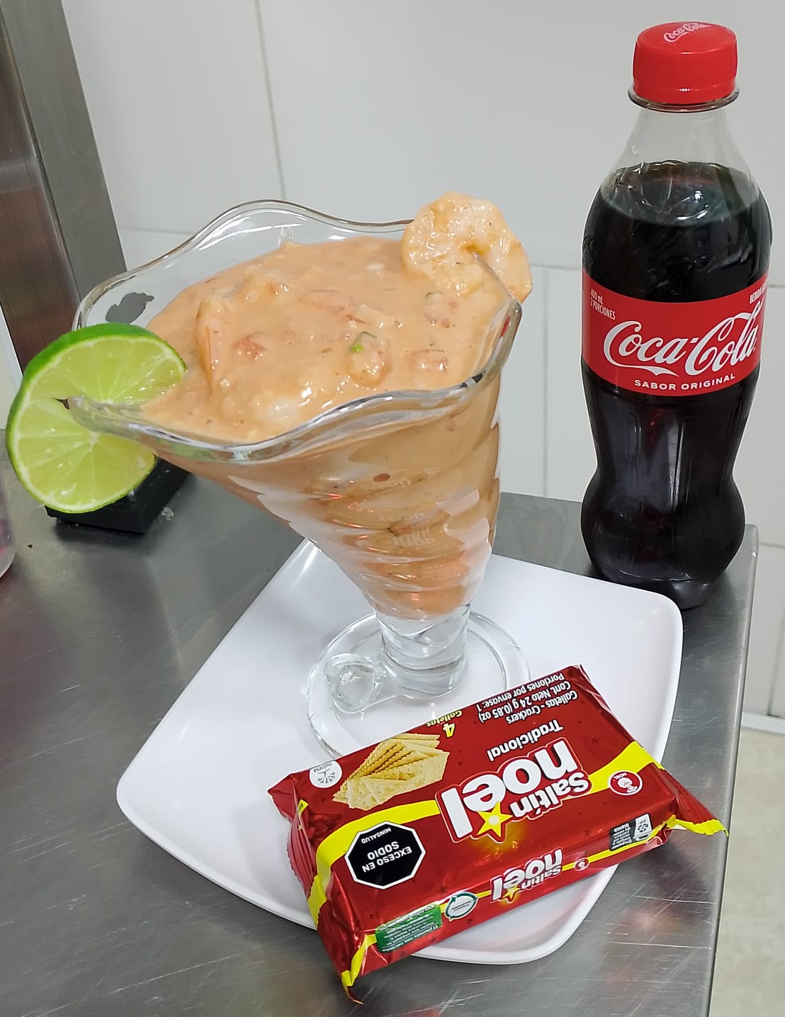 150g De camarones bañados en salsa(salsa de tomate y mayonesa, cebolla,tomate y cilantro picado, áji, vino sansón, sal y limón) viene acompañado con galletas saltin personal y una coca cola de 250 ml.