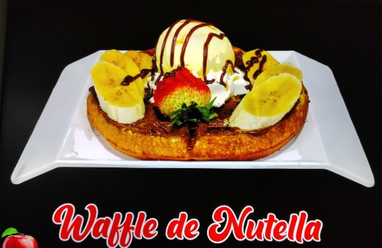 Tortilla de waffle, con Nutella o arequipe, fresas y banano picado, crema de leche, porción de helado, crema Chantilly, barquillos, cerezasdurazno y kiwi.