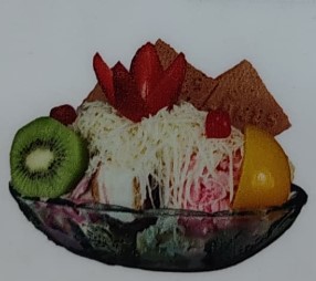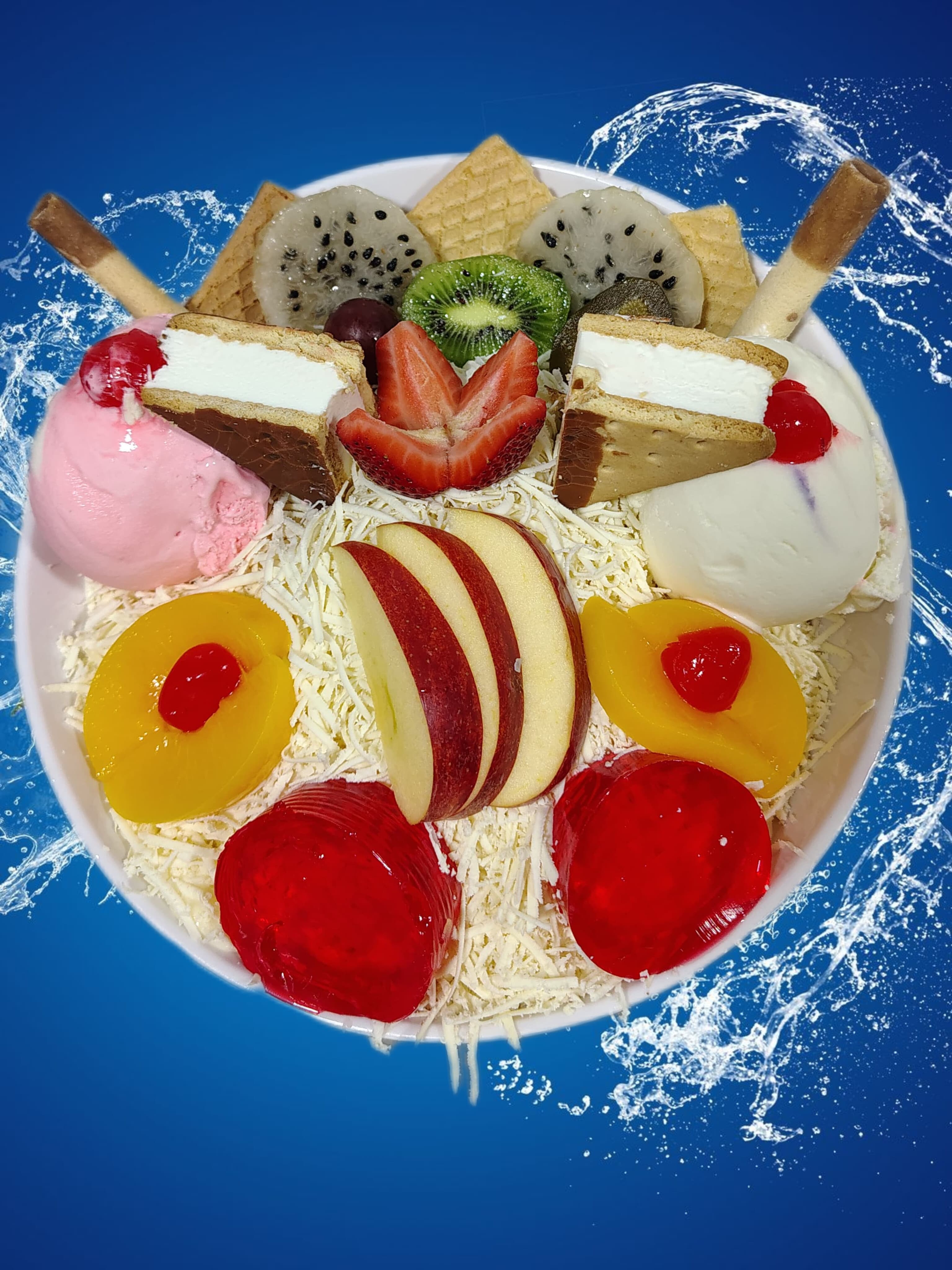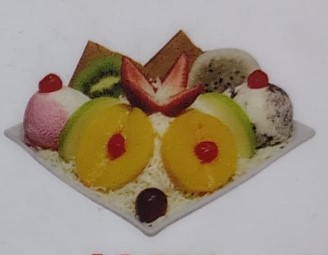 Dos Kml de fruta picada Papaya, banano, manzana, mango, fresa, crema de leche, queso, kiwi, durazno, pitaya, uva, cereza doble porcion de helado y platillo de helado acompañado de barquillos y galletas helado.