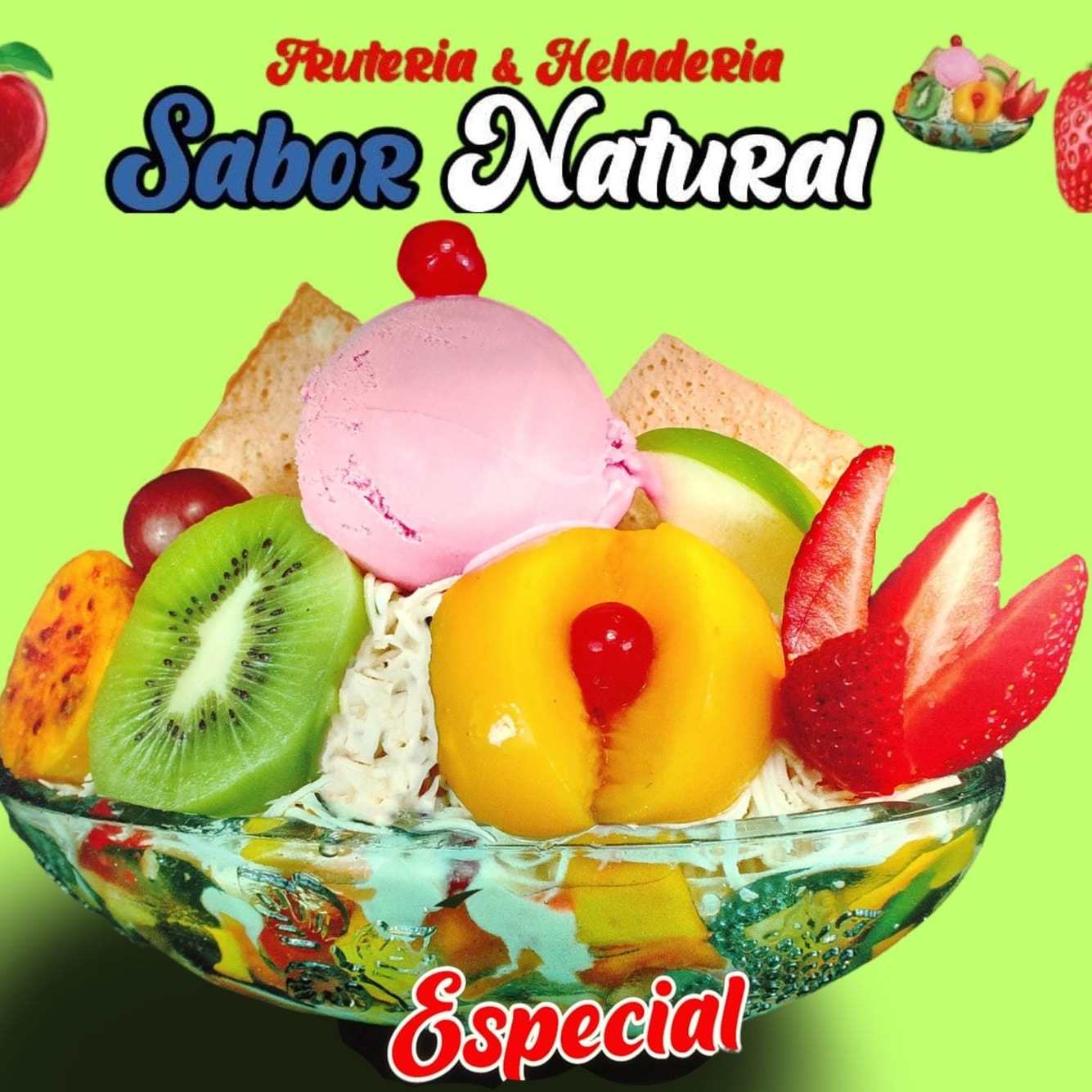 Papaya, banano, manzana, piña, mango, fresa, crema de leche, queso, kiwi, durazno, pitaya, uva, cereza y helado.