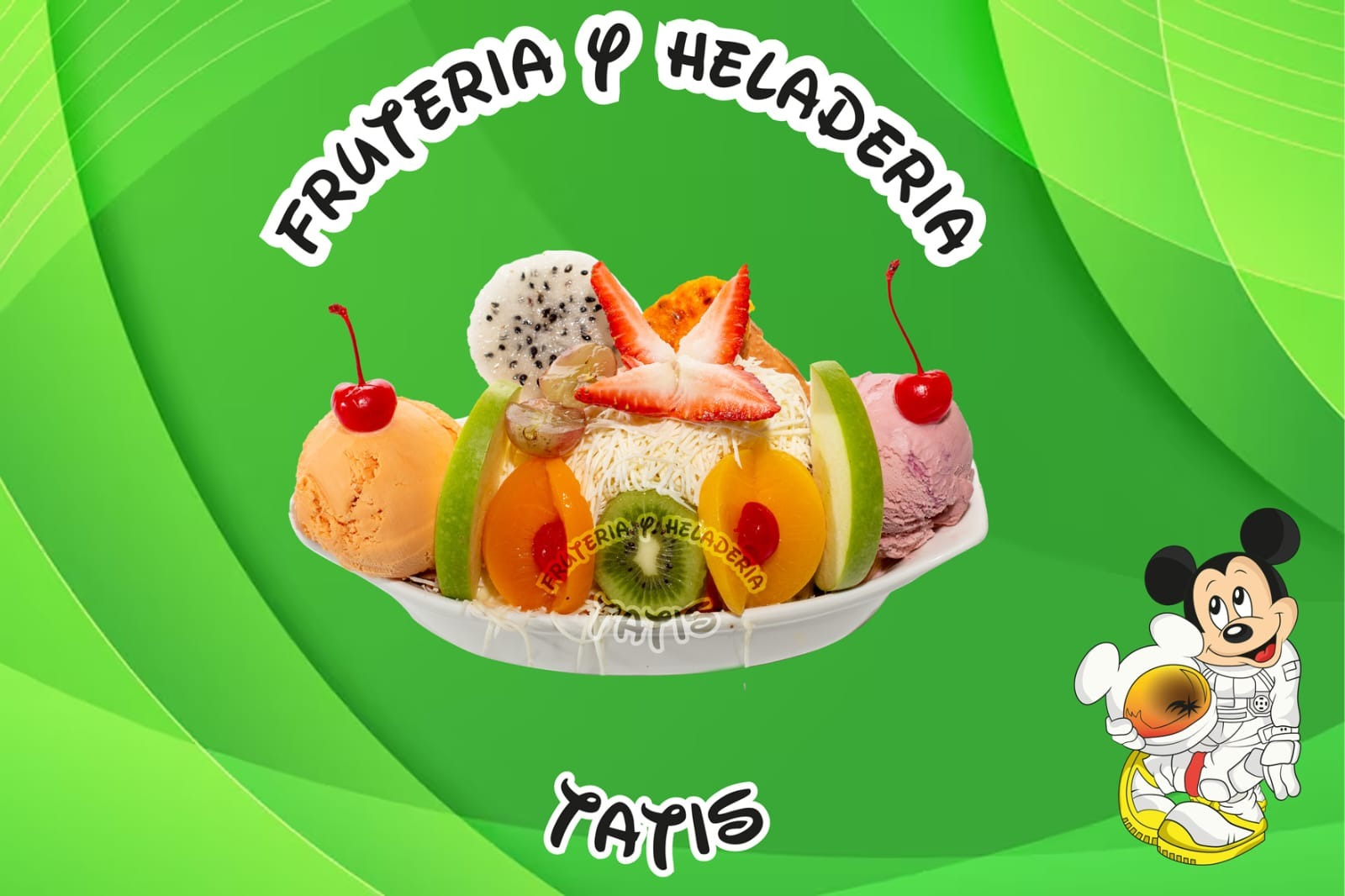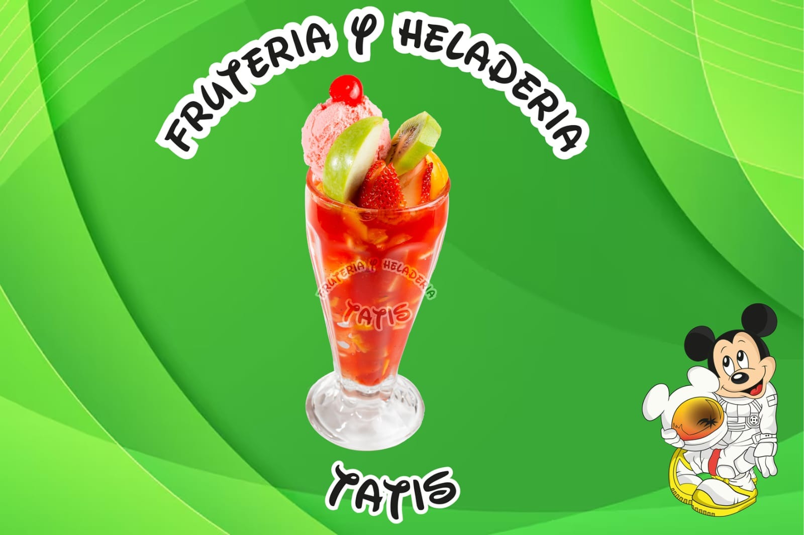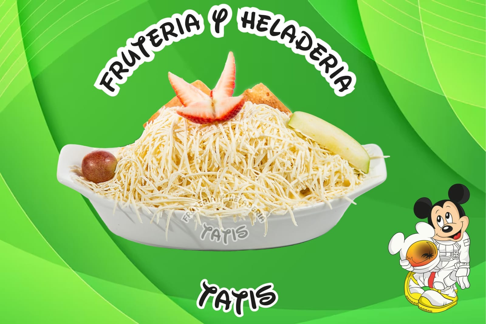 Fresa, manzana, mango, papaya, banano, piña, durazno, uva y helado.