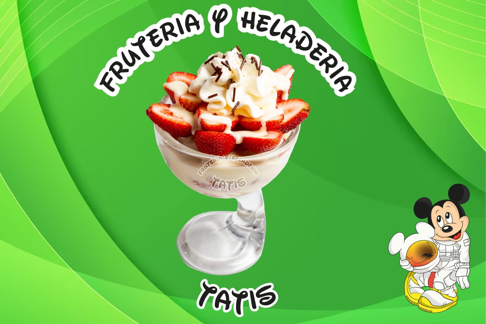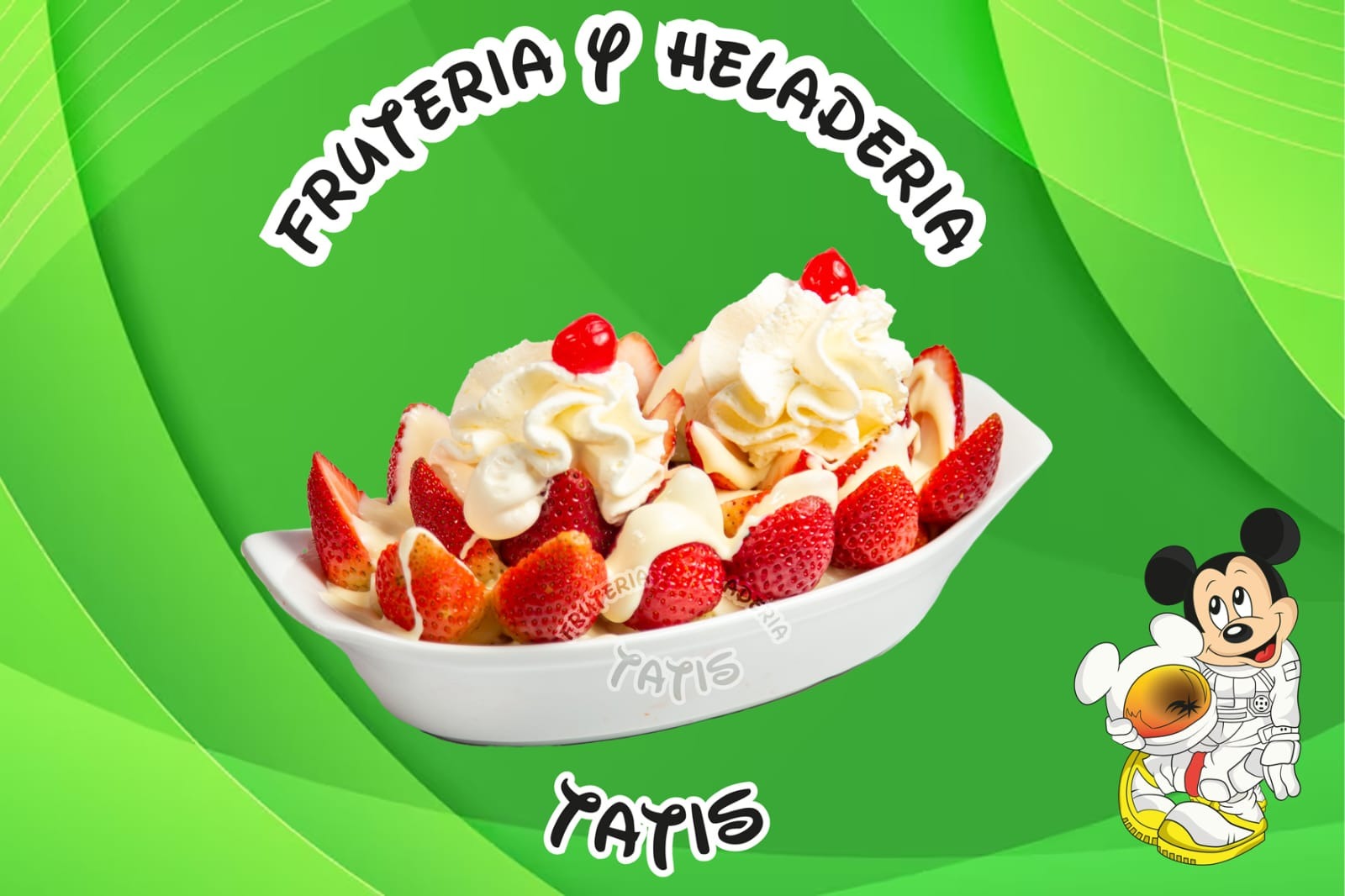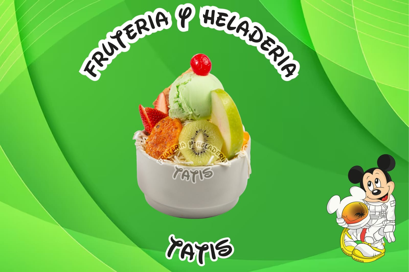 Fresa, manzana, mango, papaya, banano, piña, durazno, uva y helado.