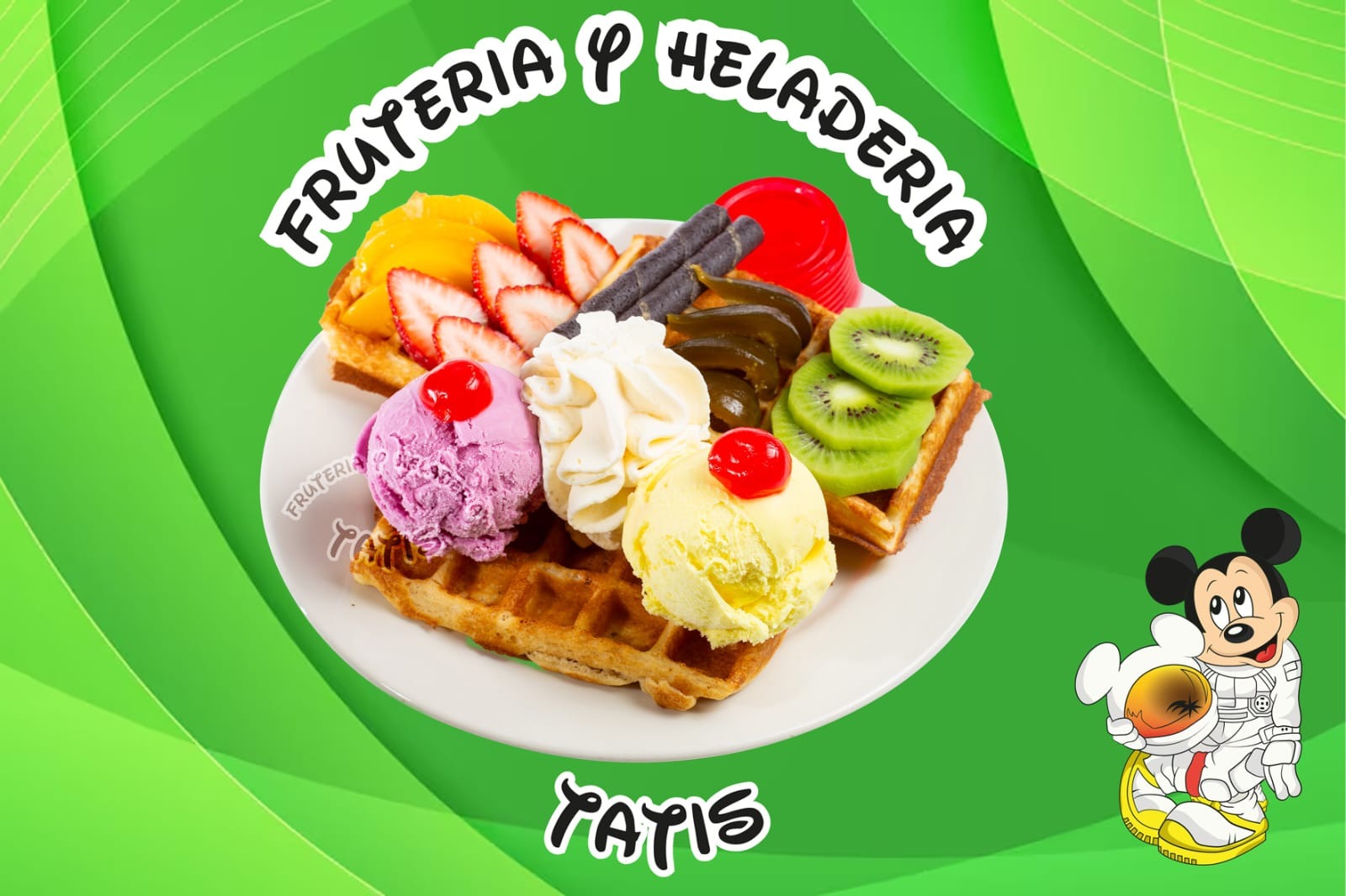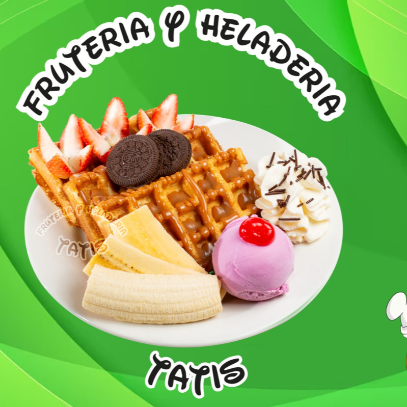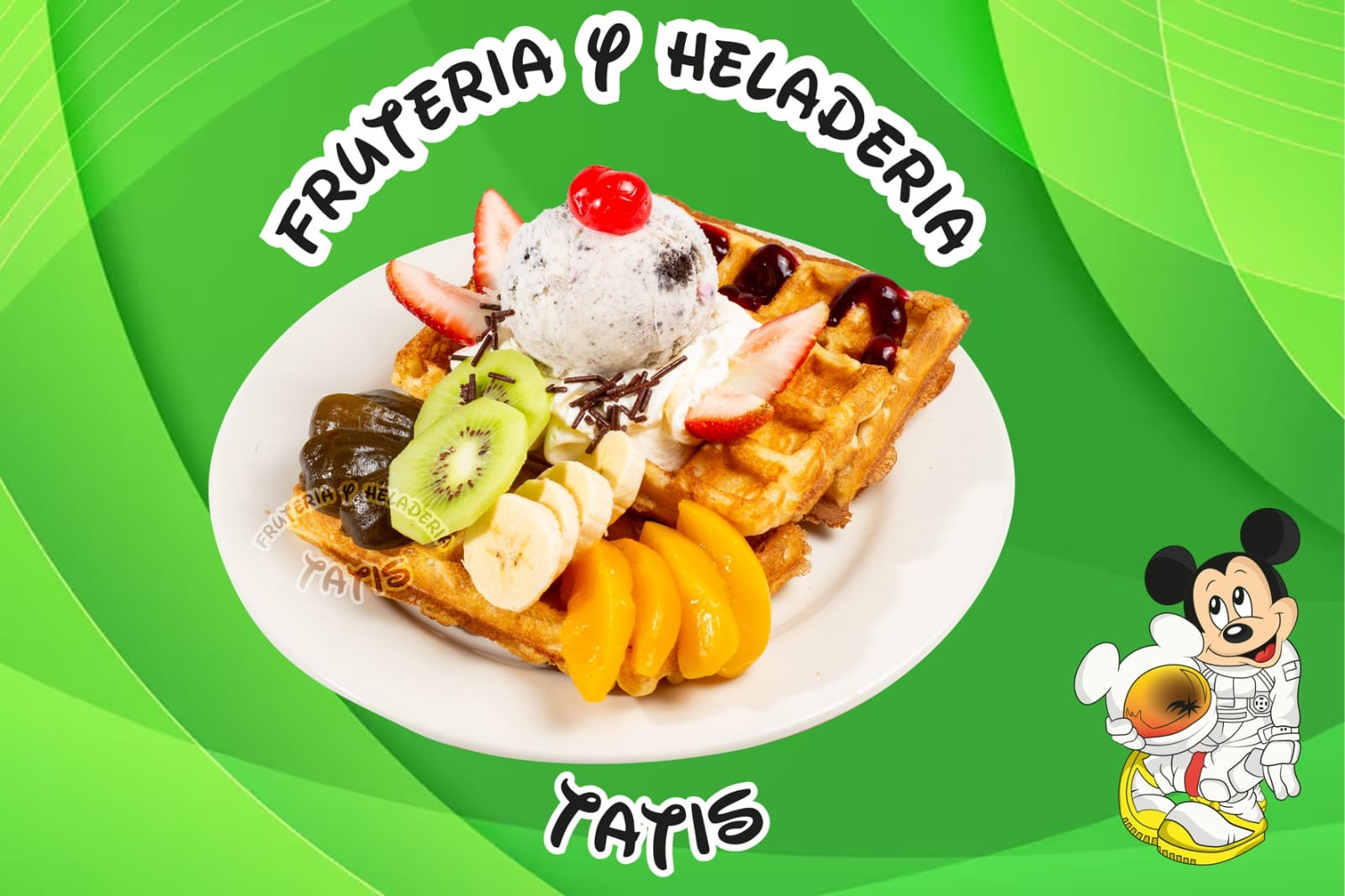 Delicioso waffle con melocotón, kiwii, banano, barquillos de fresa, dos porciones de helado con cereza.