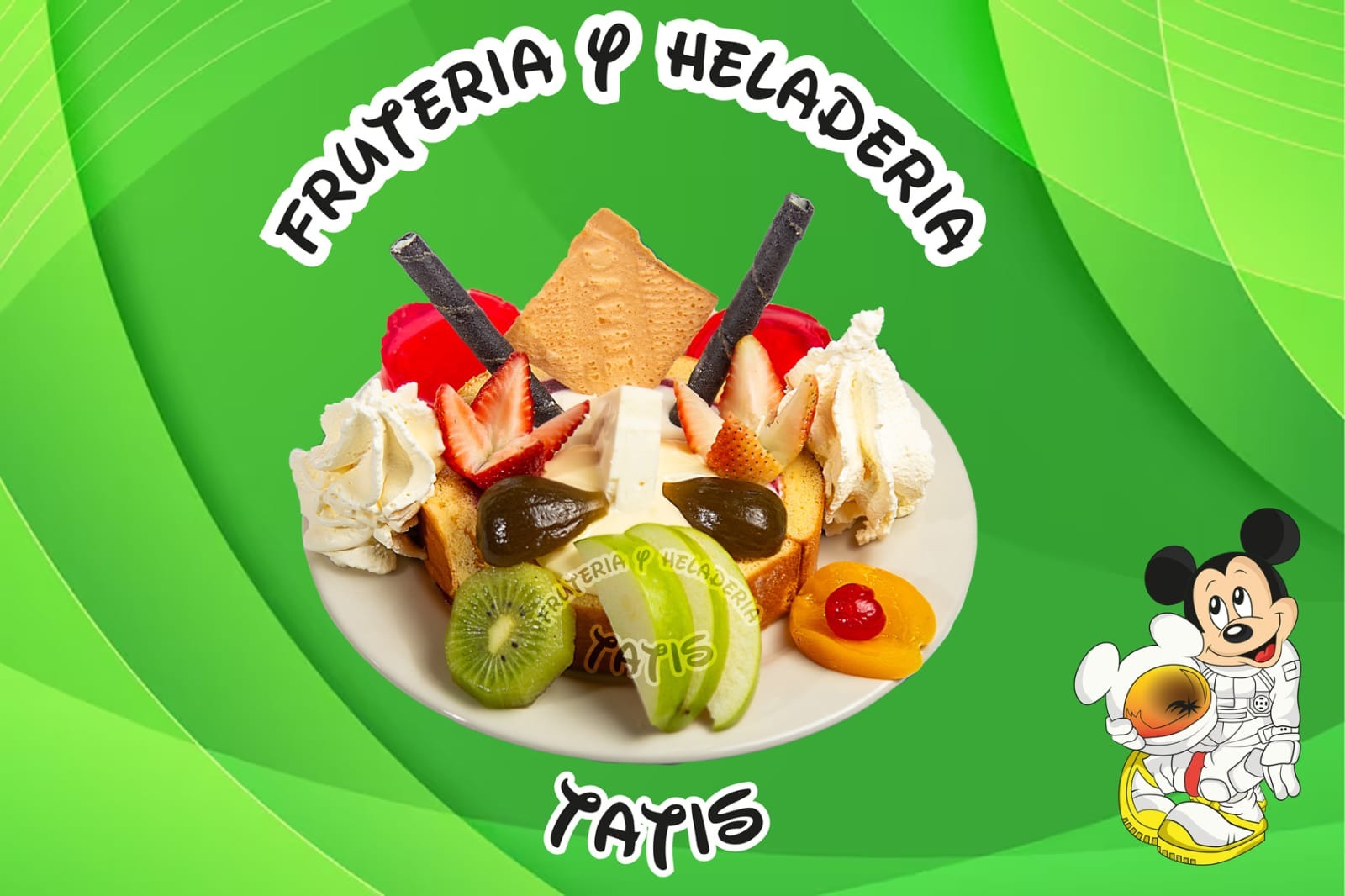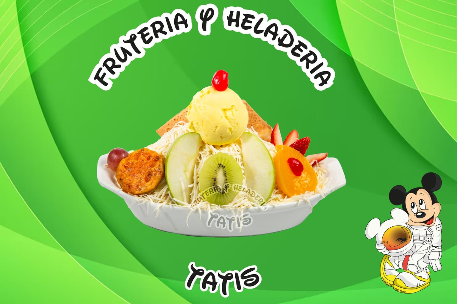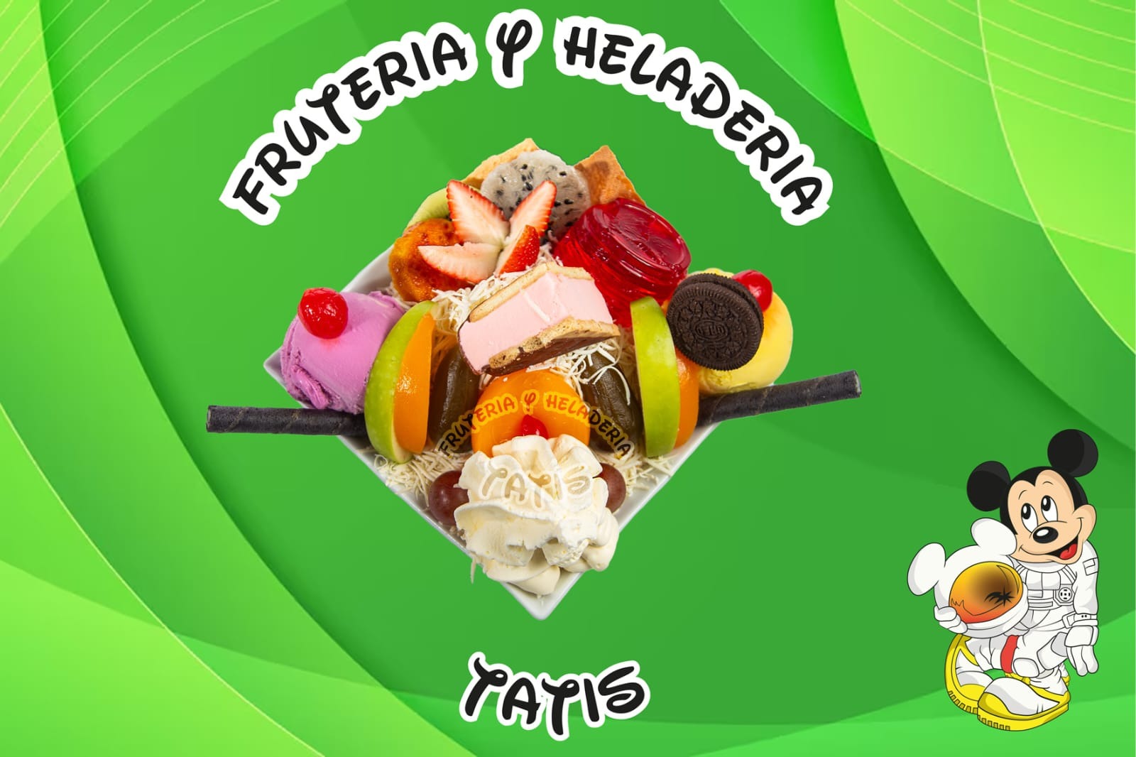 Picado de frutas: mango, fresa, banano, papaya, piña, manzana crema, queso, 2 porciones de helado, durazno, barquillo, brevas, gelatina, crema de chantilly, galleta Oreo, masmelo, kiwi, higo, uva, fresa, galletas miel y salsa de mora.