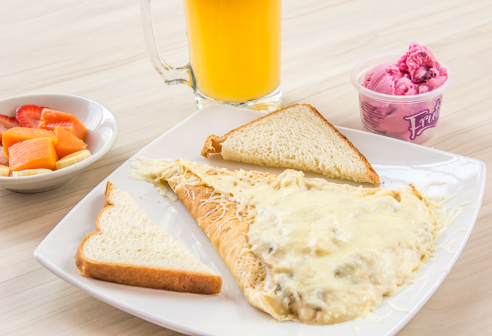 Crepe con carne desmechada, pollo y champiñones, queso más jugo 12 onzas y porción de helado. Fruta y pan.