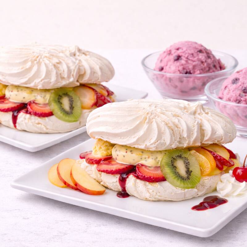 Merengón con frutas, dulce de guanábana, crema de leche y helado, decorado con durazno, fresa y manzana.