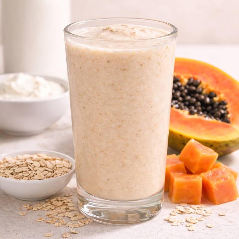 Batido de yogur griego sin azucar, leche, papaya y avena.