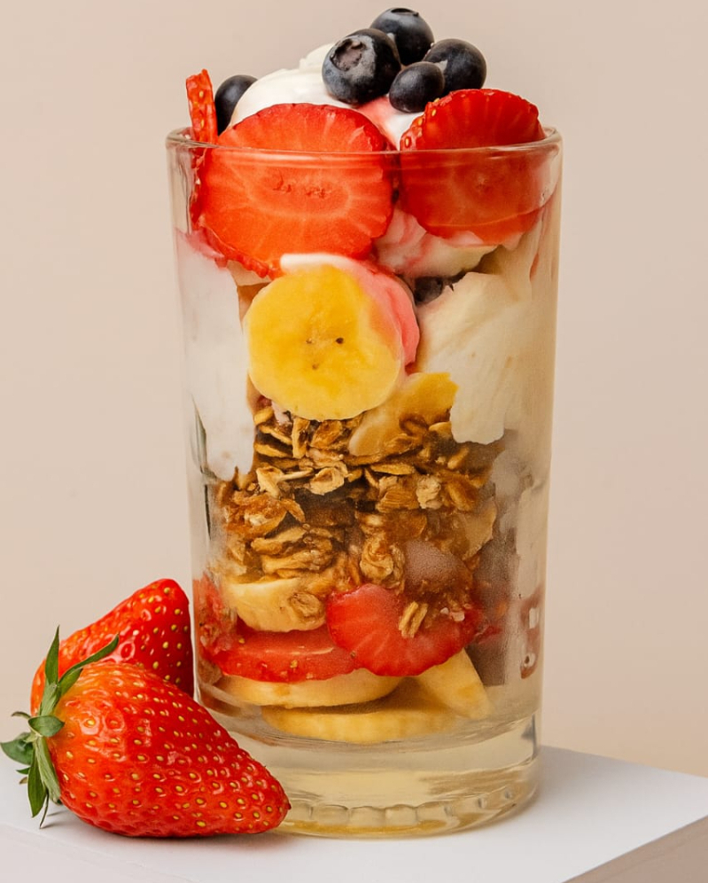 Fresa, banano, arándanos, granola natural, dulce de mora y helado de yogur