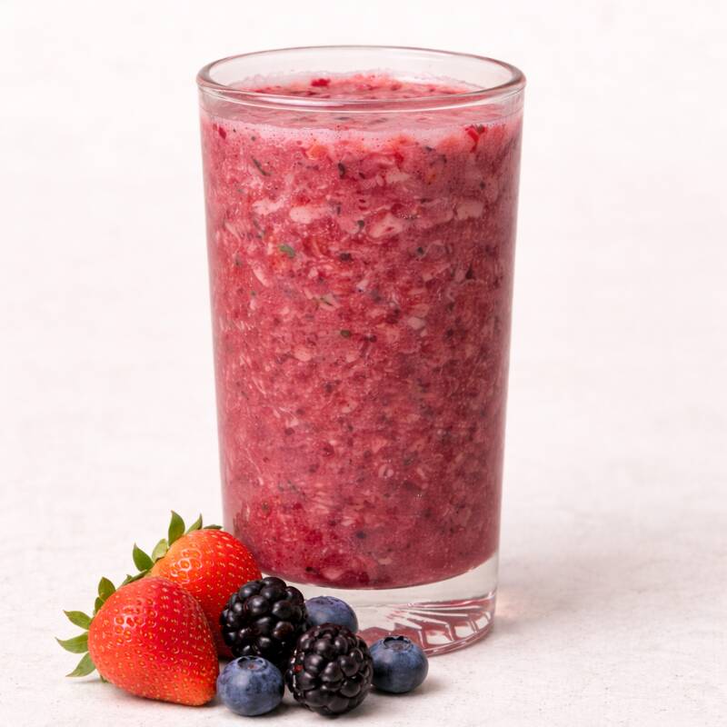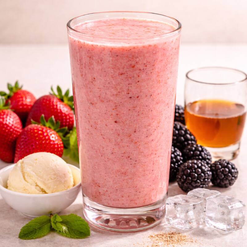 Batido de fresa, mora, licor de brandy y helado de vanilla.