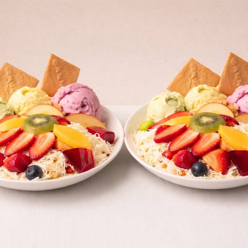 Ensalada 3 sabores de helado, queso, crema de leche, papaya, sandia, banano, melón, mango, manzana, fresa, kiwi, gelatina, uvas isabelinas, crema chantilly y cereza + gratis sundae a elección.