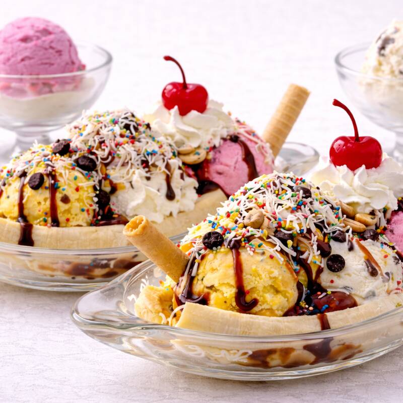 Tres (3) sabores de helado, banano, crema de leche, queso, coco, maní, uvas pasas, barquillos, salsas, chantilly y cereza.