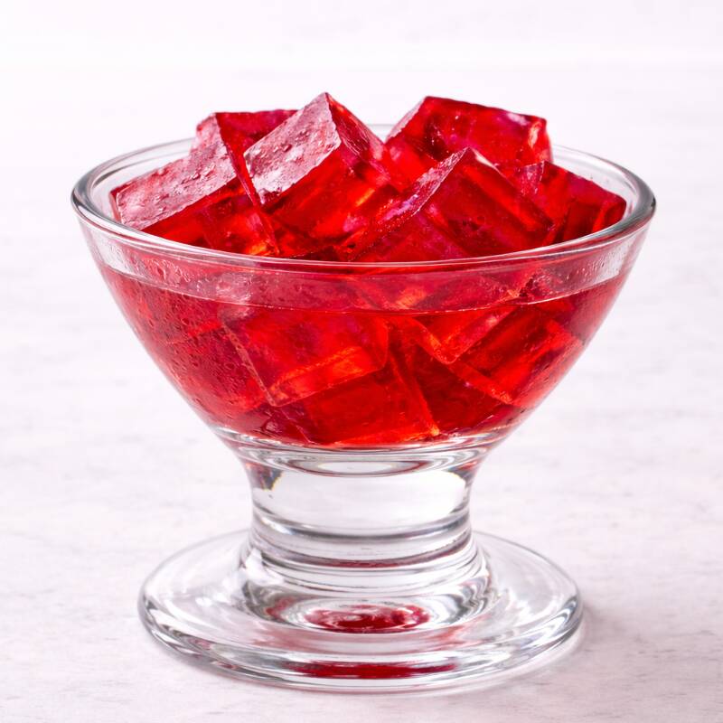 Gelatina cortada en cubitos sabor frambuesa. Porción de 4 oz