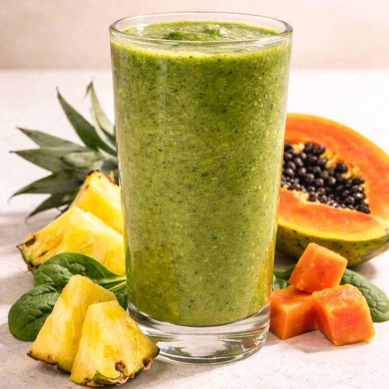 Naranja, piña, papaya, espinaca, miel y jengibre 12oz