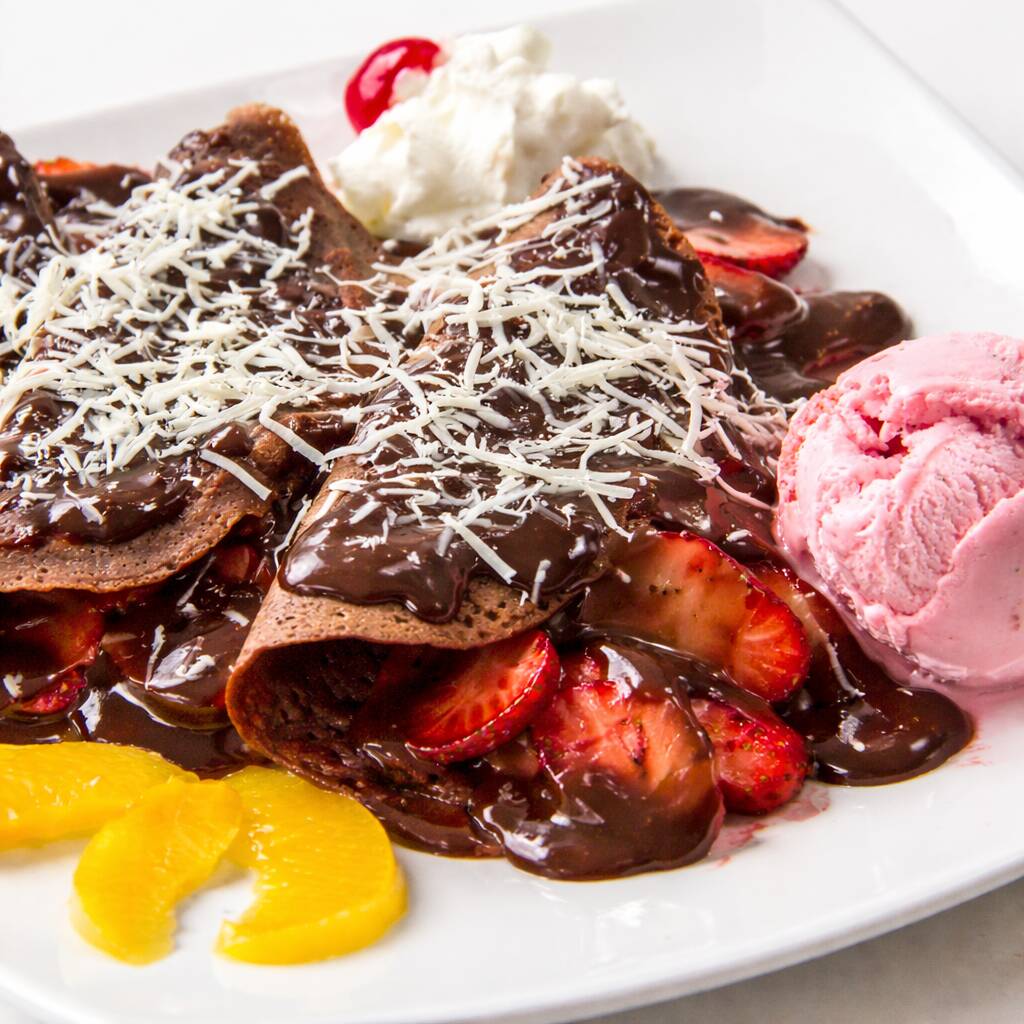 Tortilla dulce, nutella, queso, fresas, durazno, salsa de chocolate, cereza, chantilly y porción de helado.
