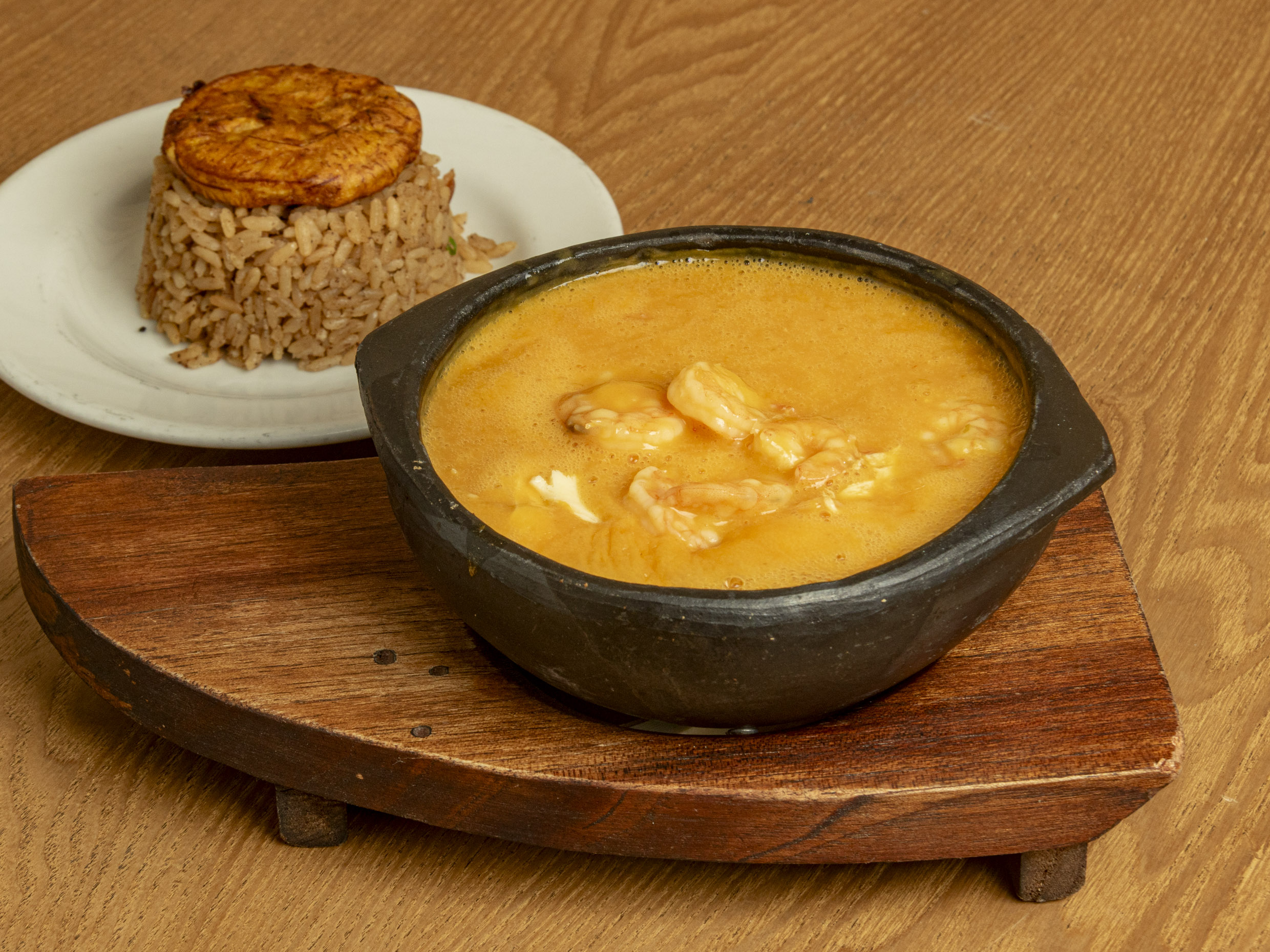 Camarones preparados en base de mariscos, aderezados con queso y brandy al gusto, acompañado de arroz y patacón maduro.