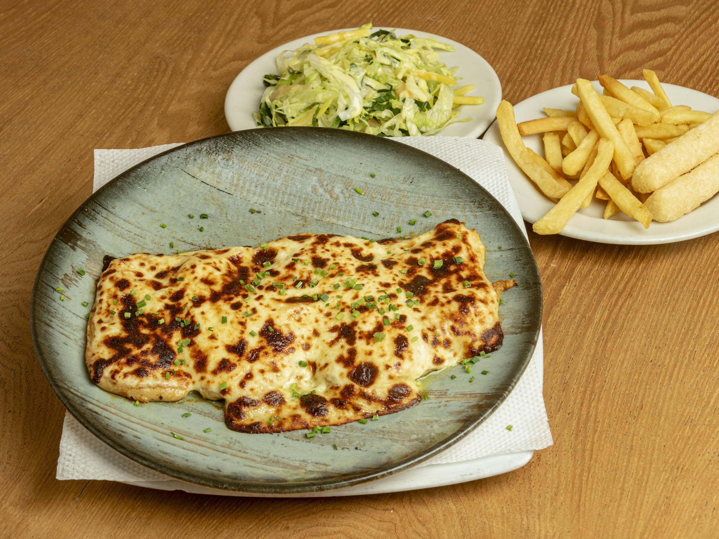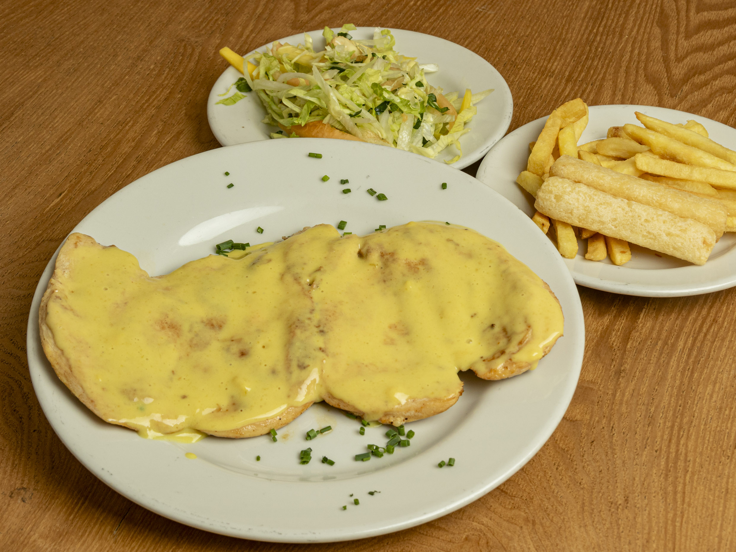 Pechuga de pollo bañada en salsa a base de queso, acompañada con papa a la francesa, croquetas de yuca y ensalada (tomate y cebolla).