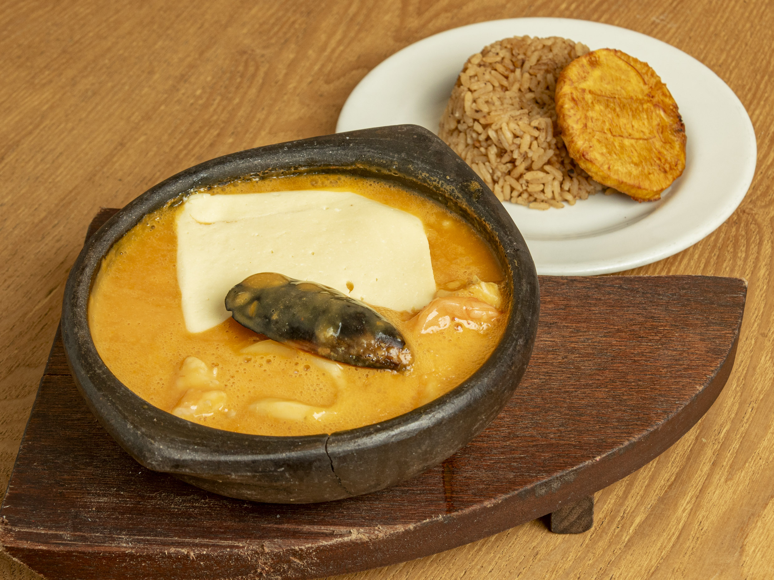 Langostino, camarón, calamar blanco, caracol, filete de róbalo, mejillón, palmitos de cangrejo, anillos de calamar, aderezado con queso y brandy al gusto, acompañado de arroz y patacón maduro.