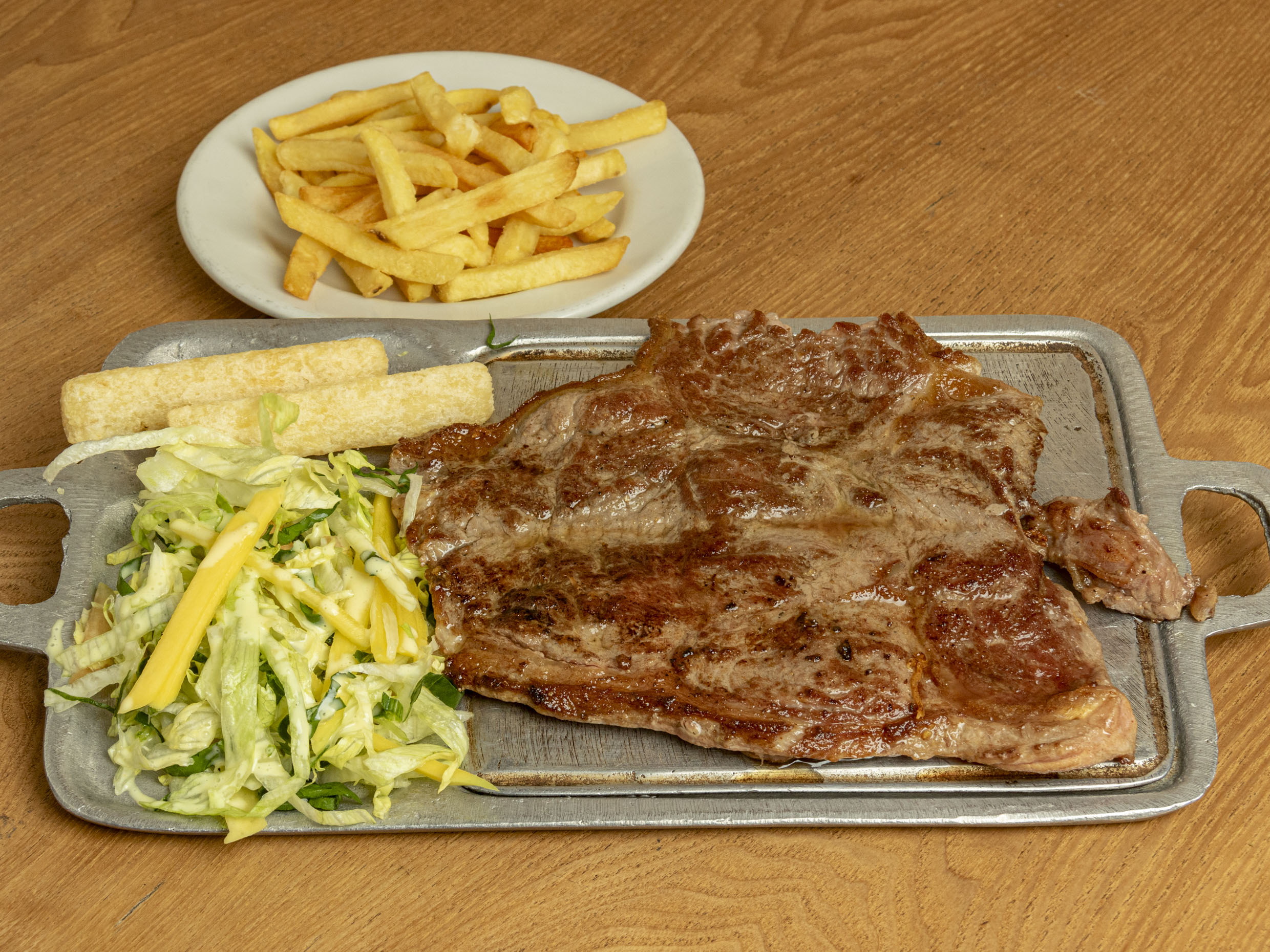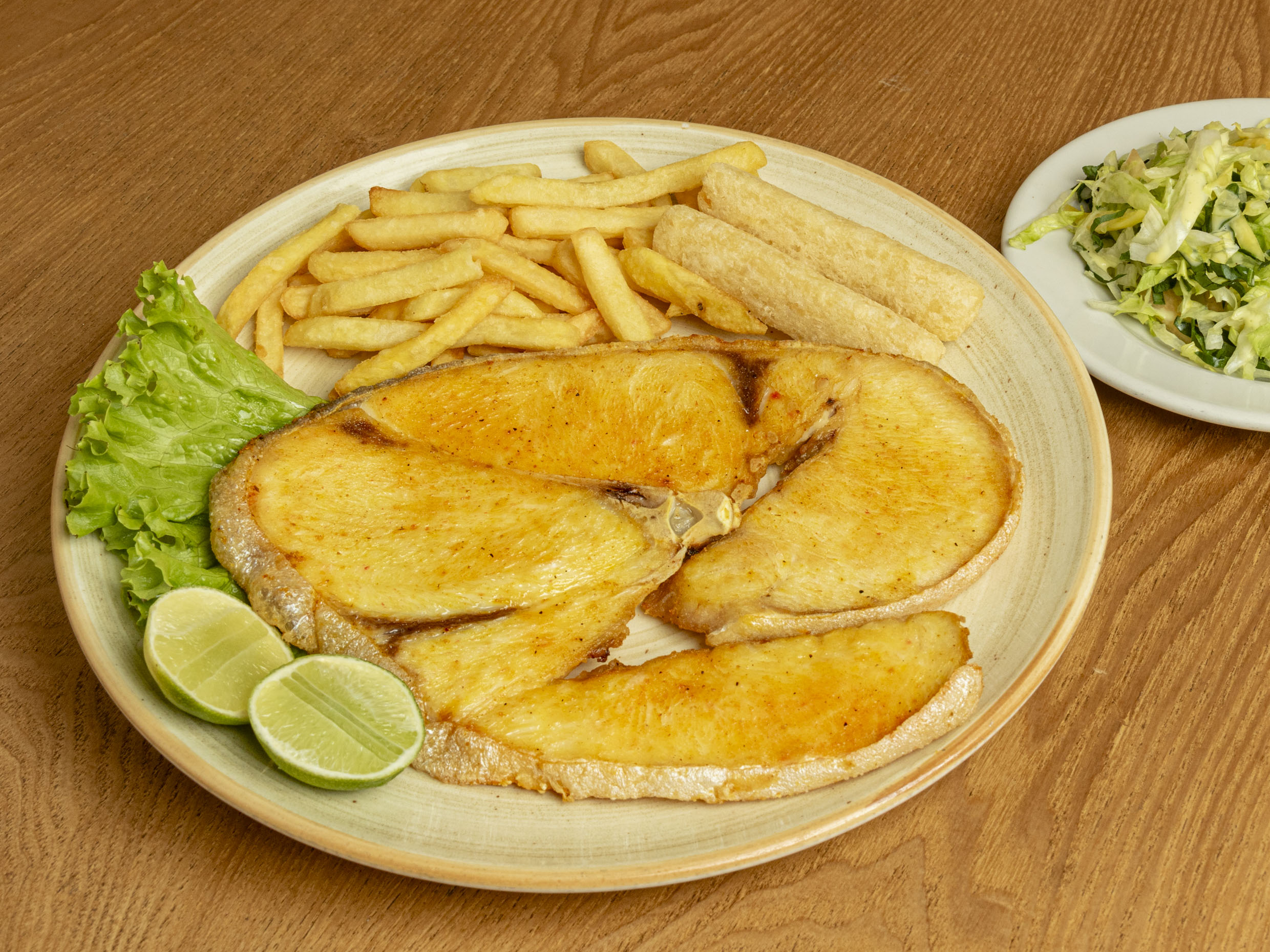 Servido con papa a la francesa, yuca y ensalada (tomate y cebolla).