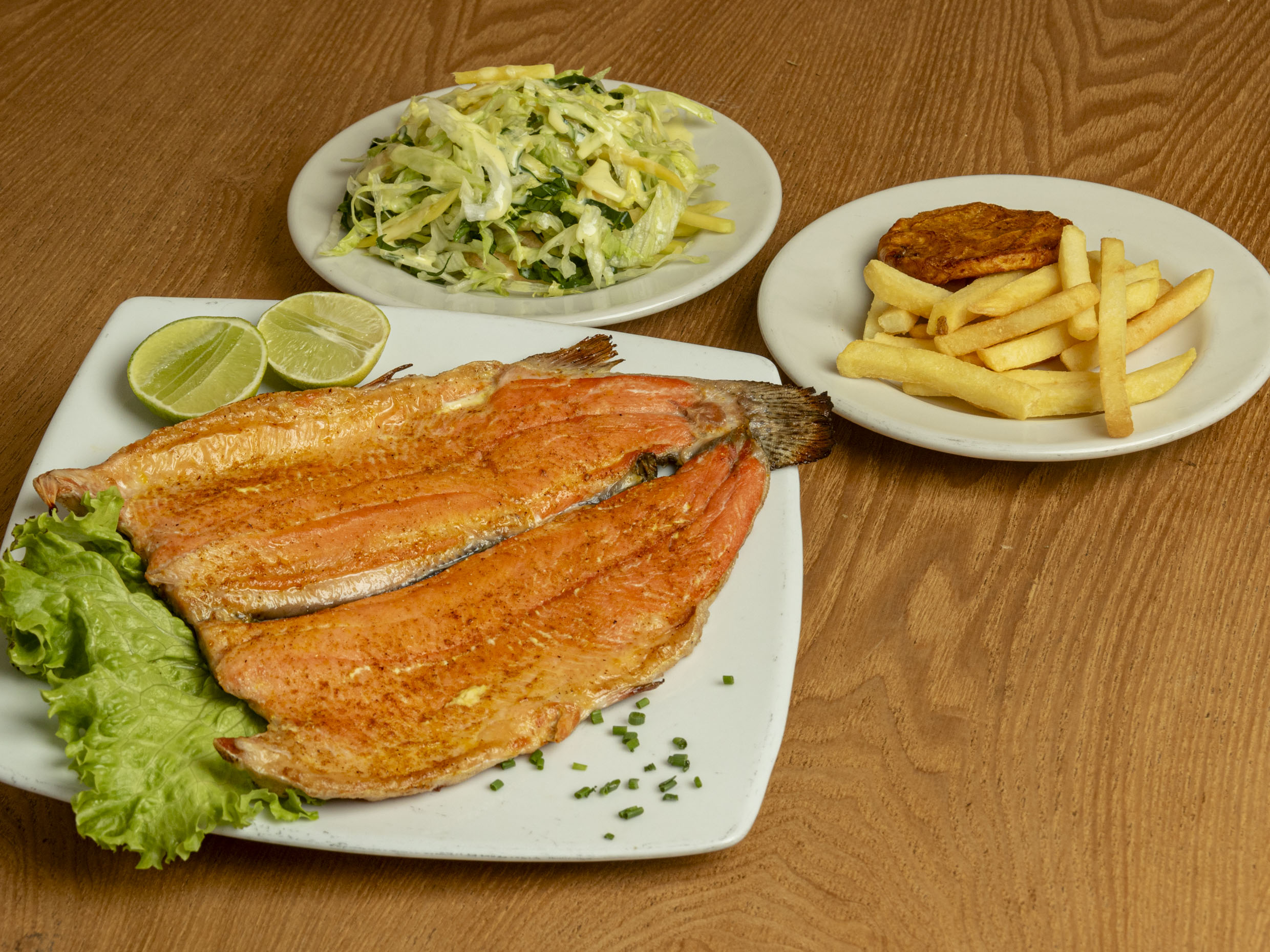 Filete de salmón acompañado de papa a la francesa, patacón y ensalada (tomate y cebolla).