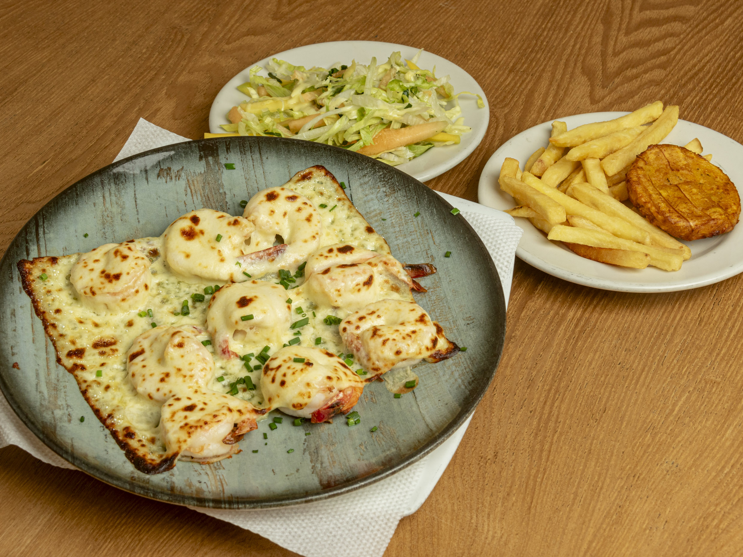Langostinos bañados en salsa blanca y queso, acompañado de papa a la francesa, patacón maduro y ensalada (tomate y cebolla).