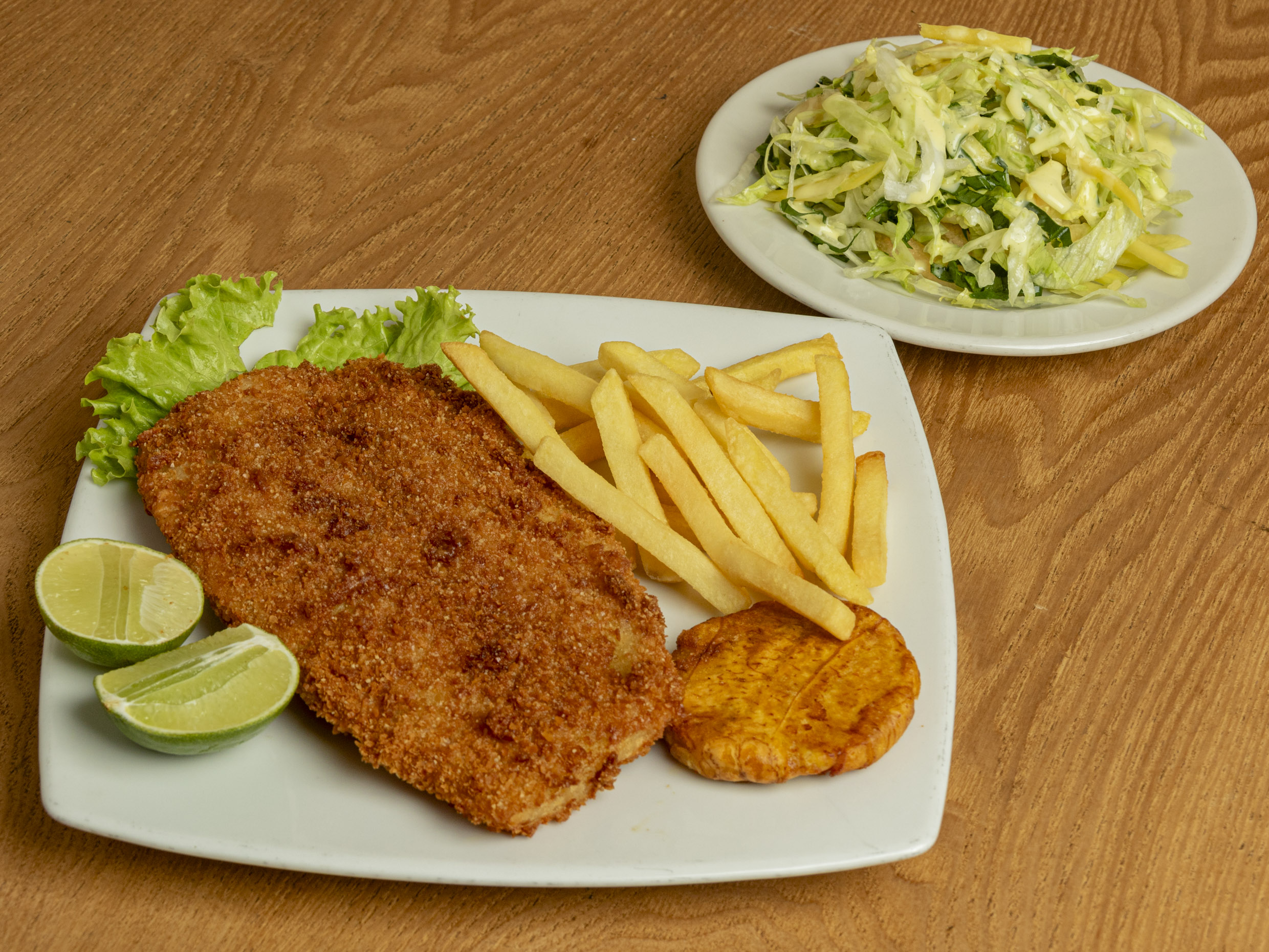 Filete apanado, acompañado de papa a la francesa, patacón y ensalada (tomate y cebolla).