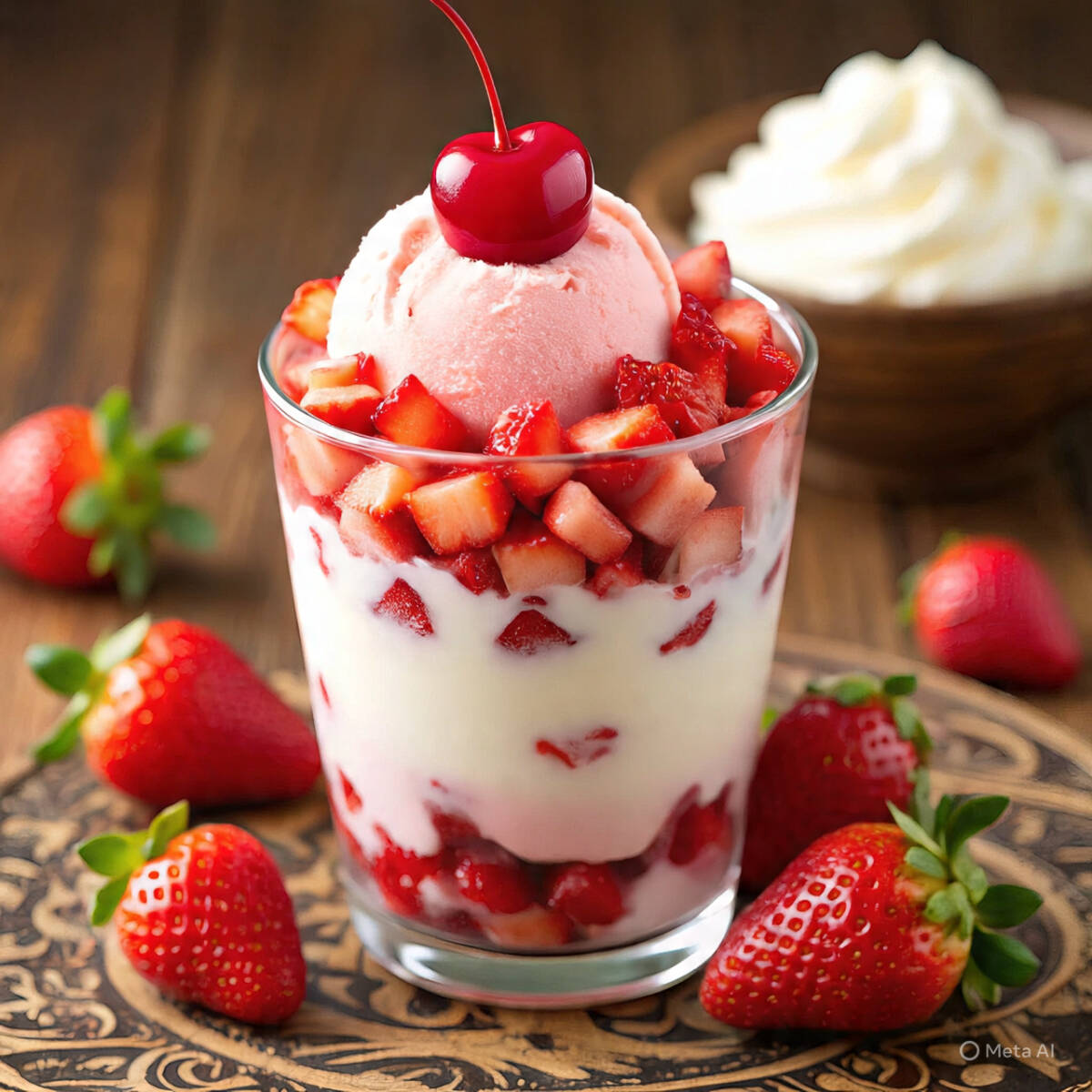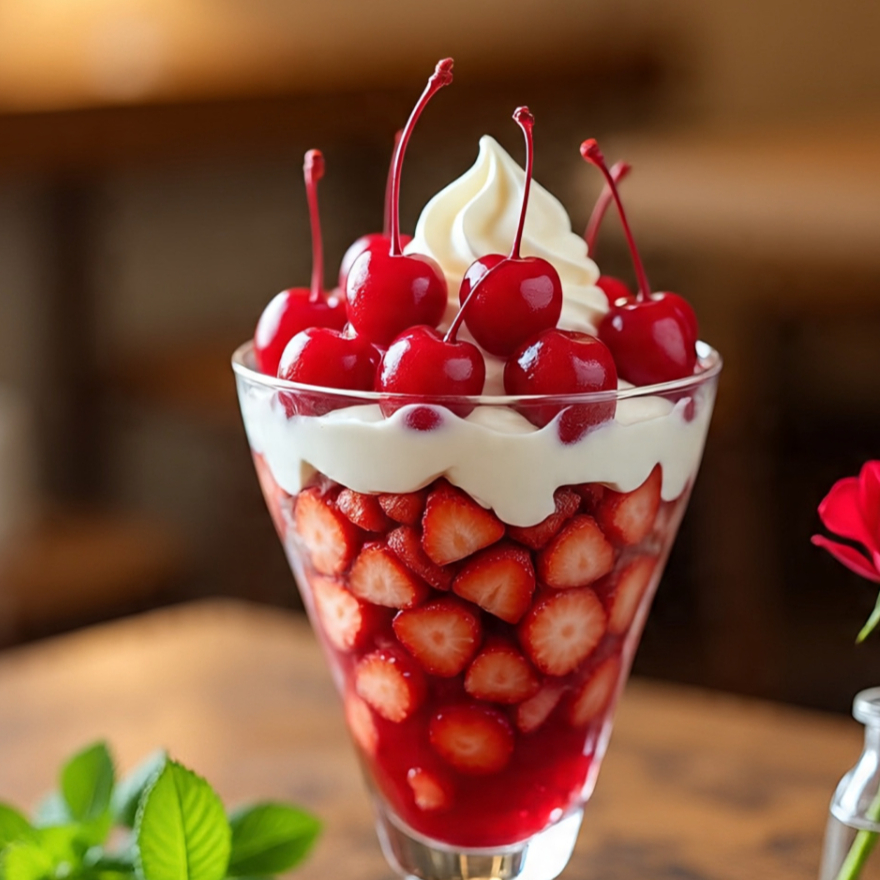 Vaso de 16 Oz de fresas con crema con 10 cerezas en almíbar