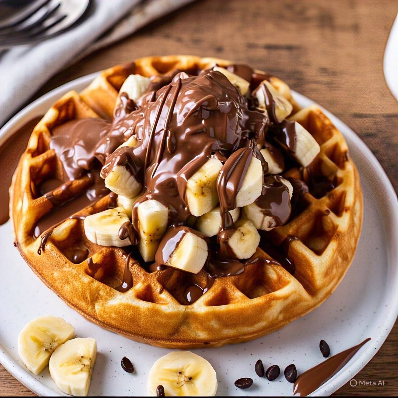 Delicioso waffle chocolate y banano.