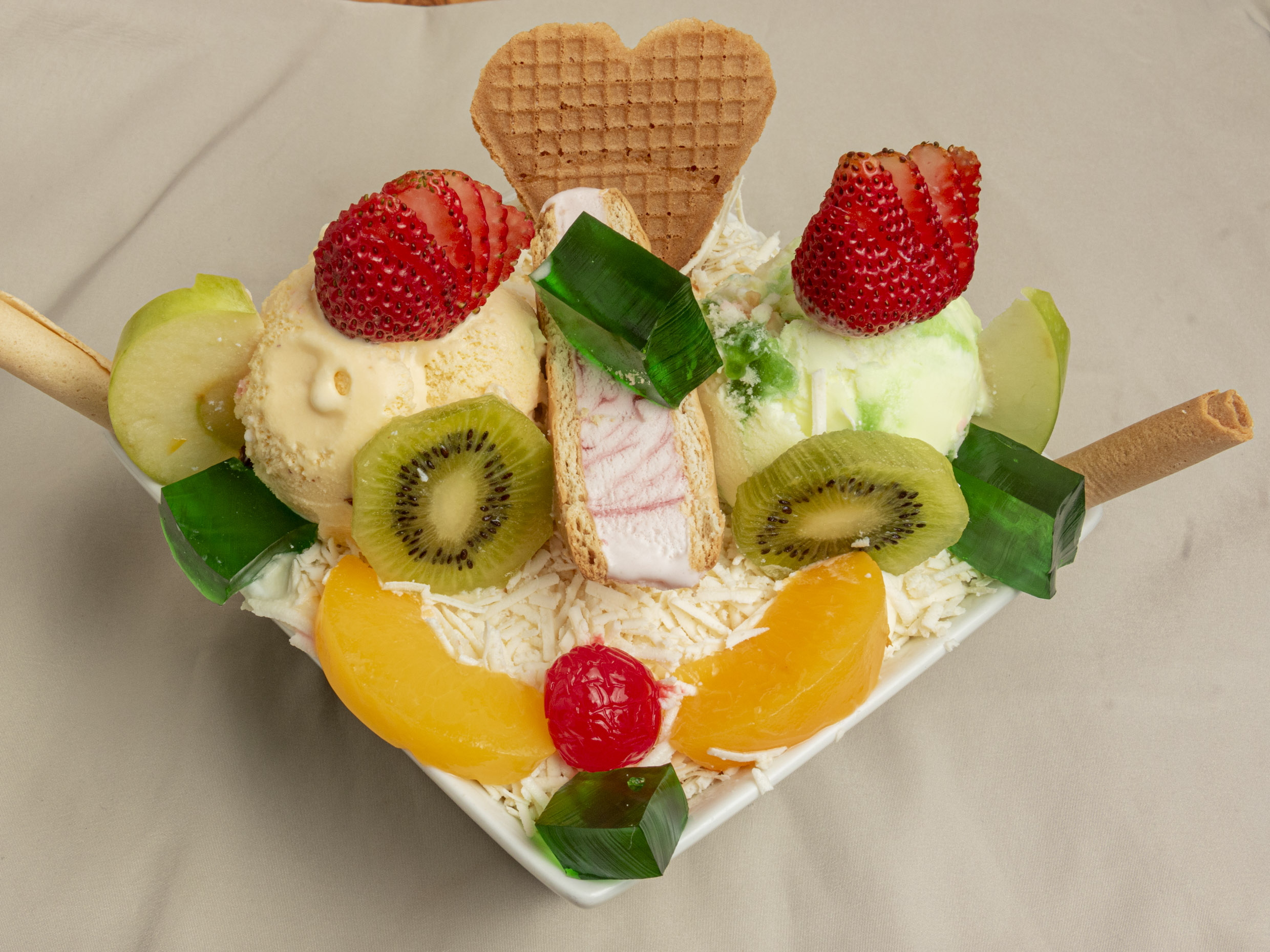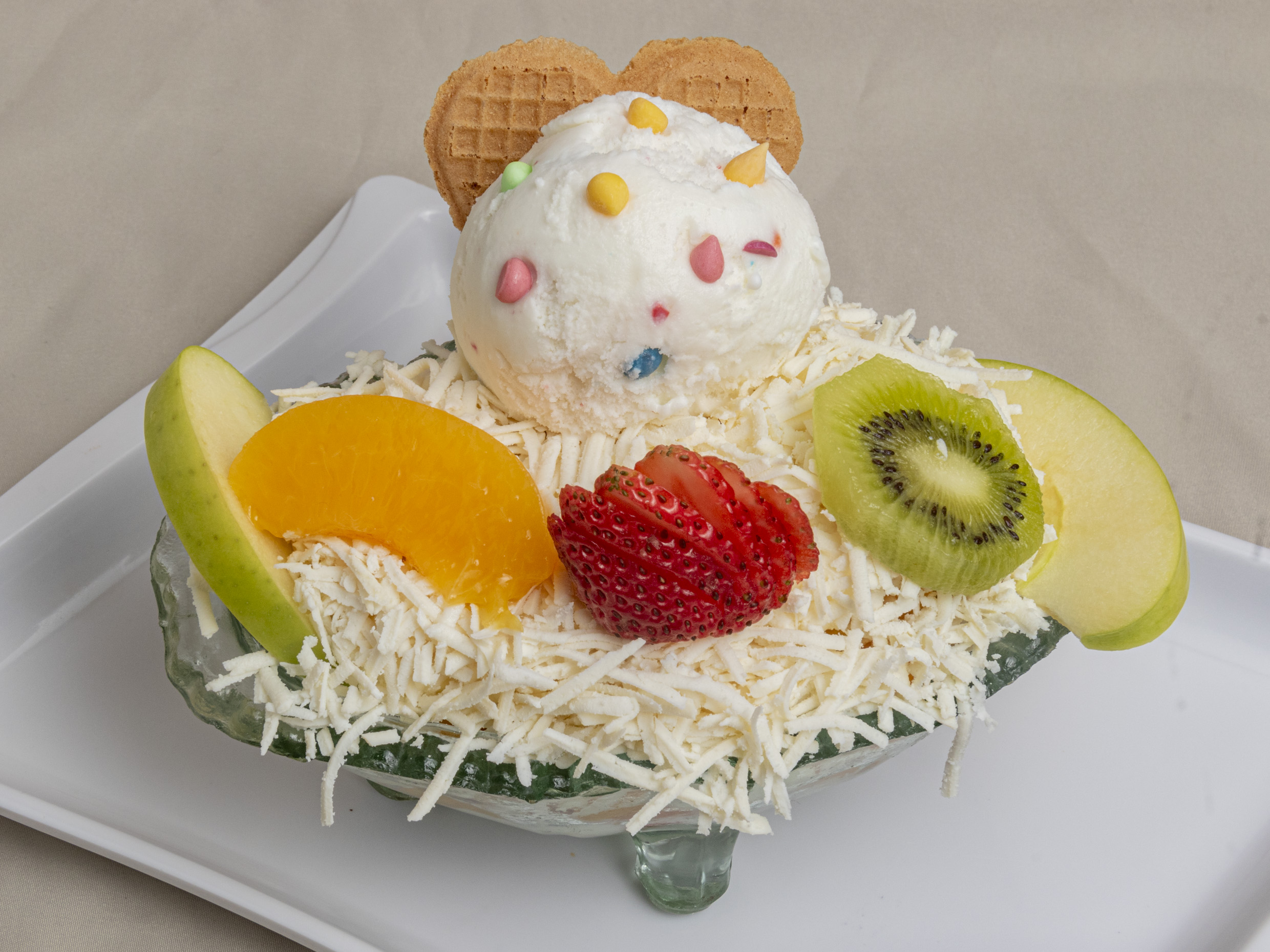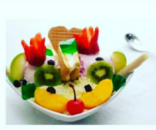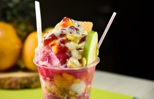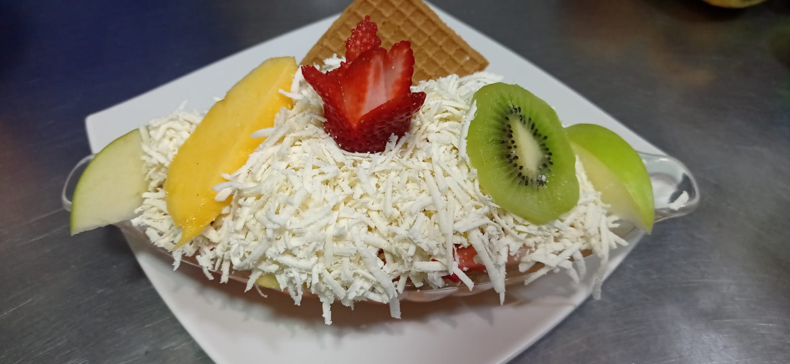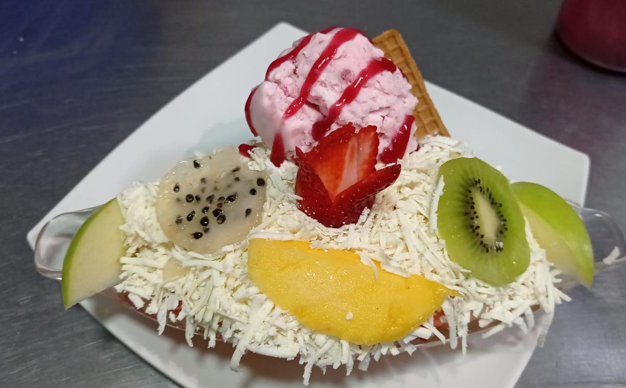 Banano, mango, fresa papaya, melon, kiwi, manzana verde, queso crema de leche, galleta durazno, dulce de mora y 2 bolas de helado medio platillo de haleado. (1 transparente)
