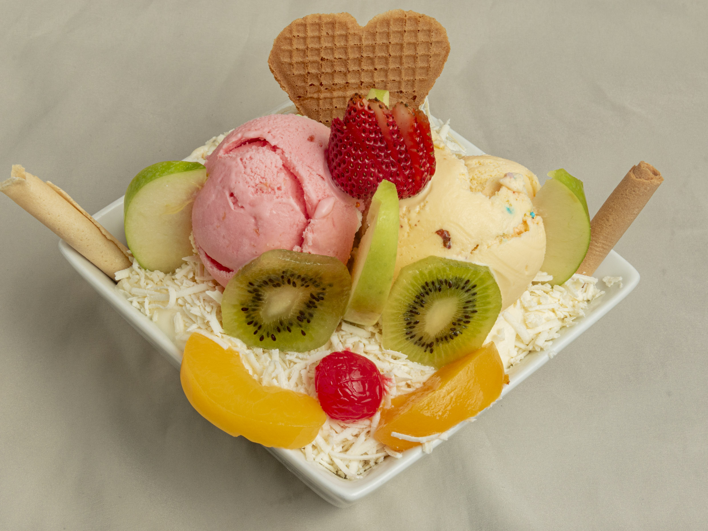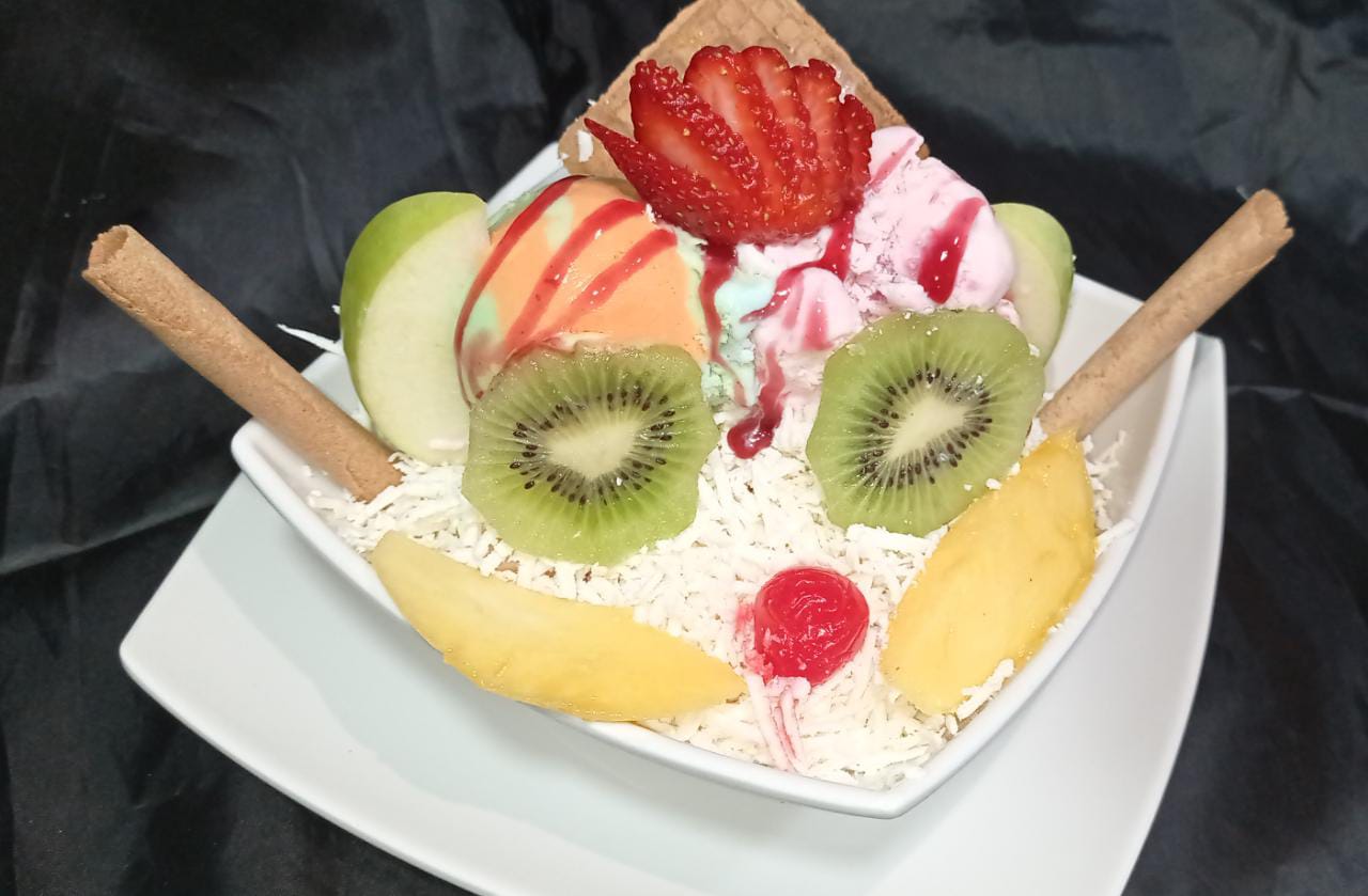 Banano, mango, fresa papaya, melon, kiwi, manzana verde, galleta durazno, dulce de mora, queso,doble porcion de helado.