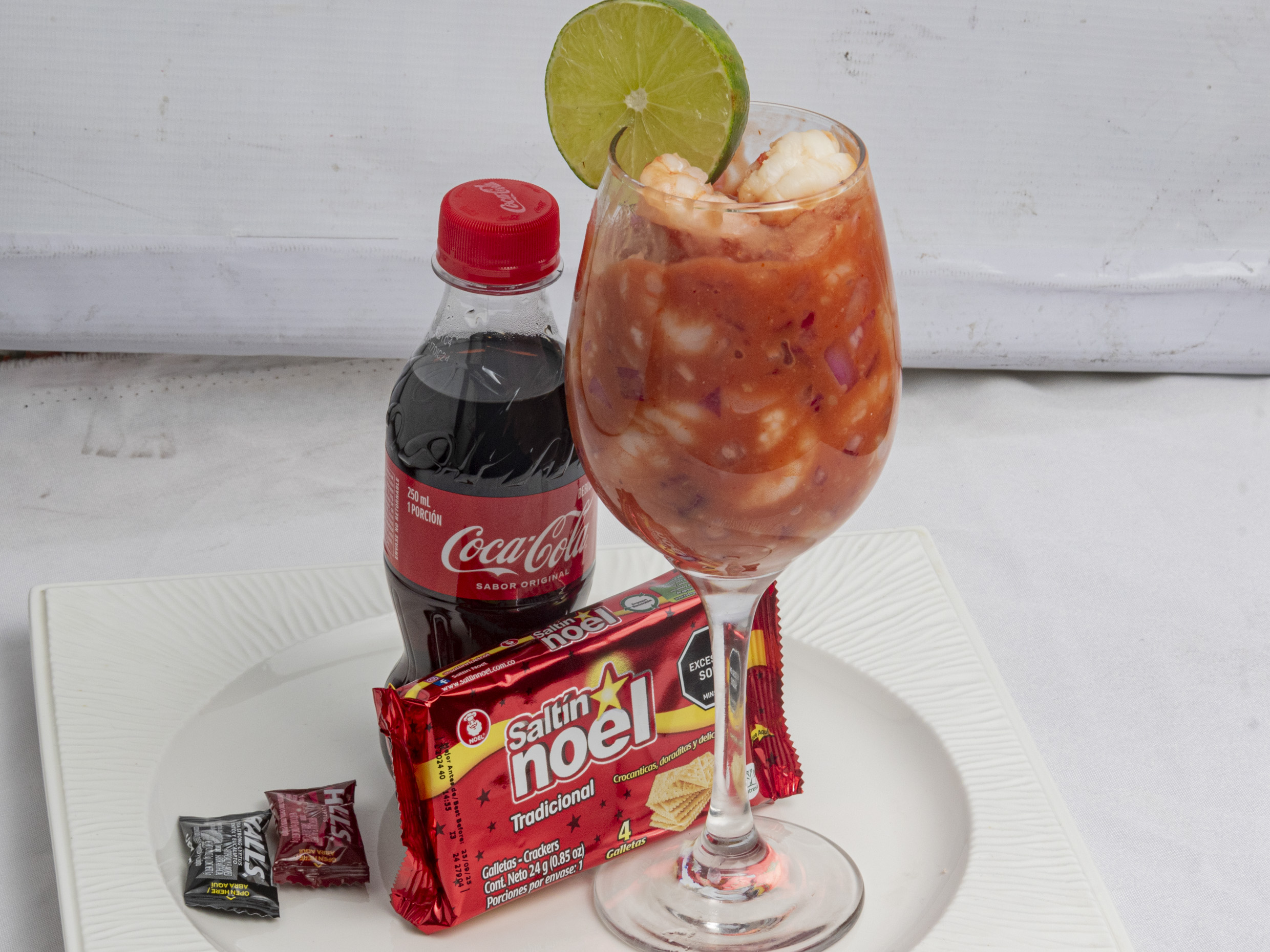 Acompañado de galletas, Halls y Coca Cola mini