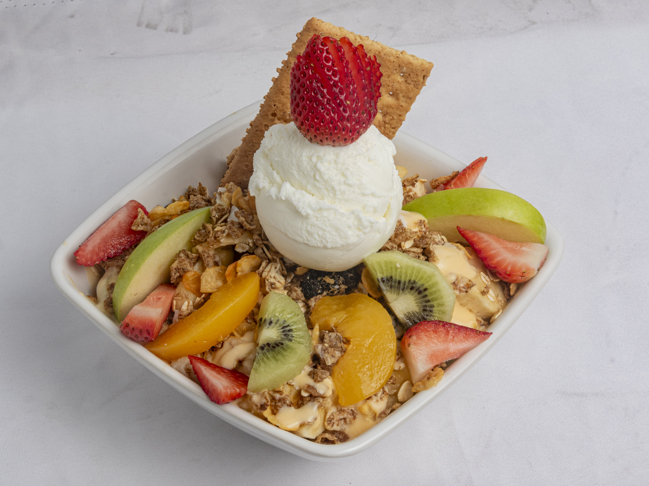 Banano, fresa, papaya, melon, manzana, yogurt, granola, porcion de helado light,