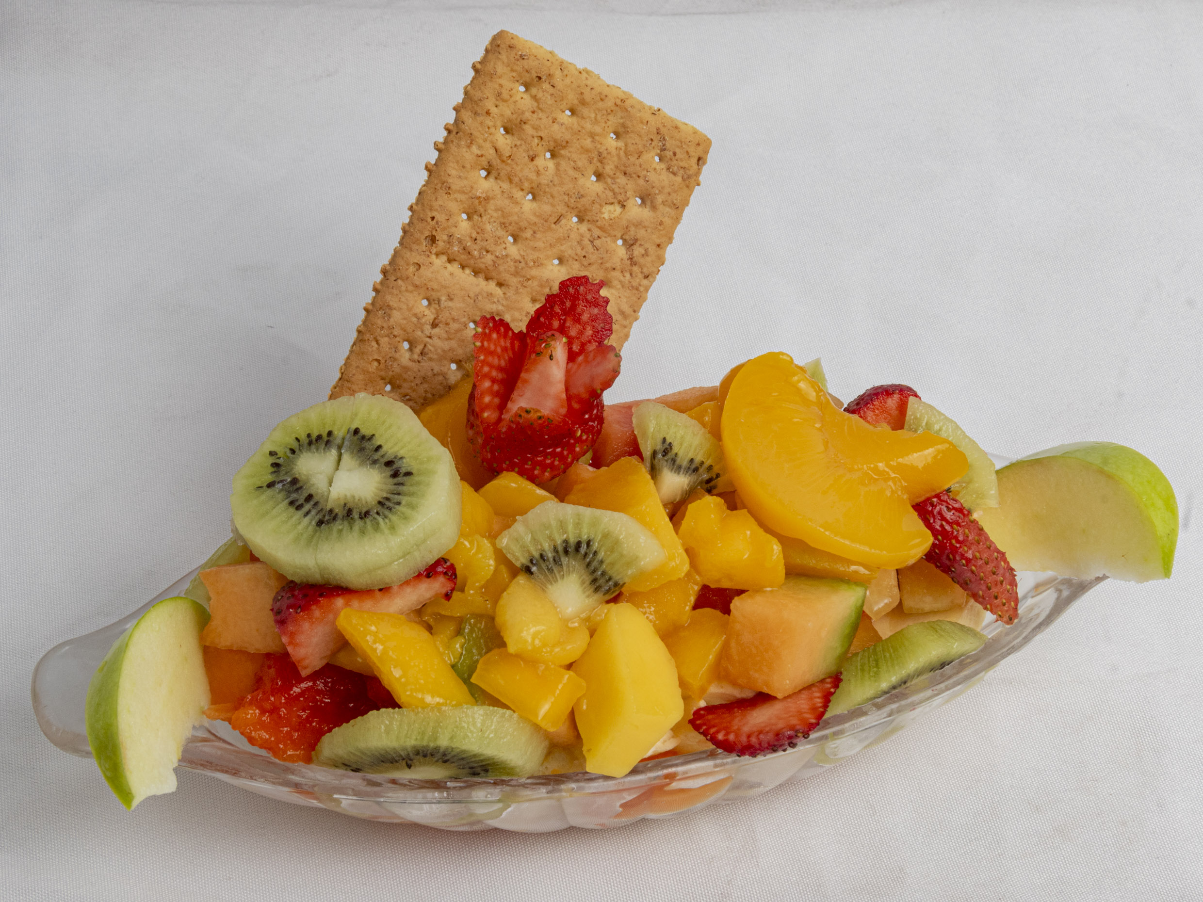 Papaya, mango, manzana, banano crema de leche queso, galleta, porcion de helado.