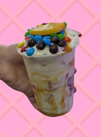 Merengon, crema, maracuya, guanabana y oreo. salsa a escoger