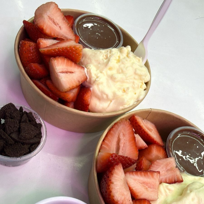 Fresas picadas, deliciosa crema de leche y chocolate, escoge 1 topping clasico