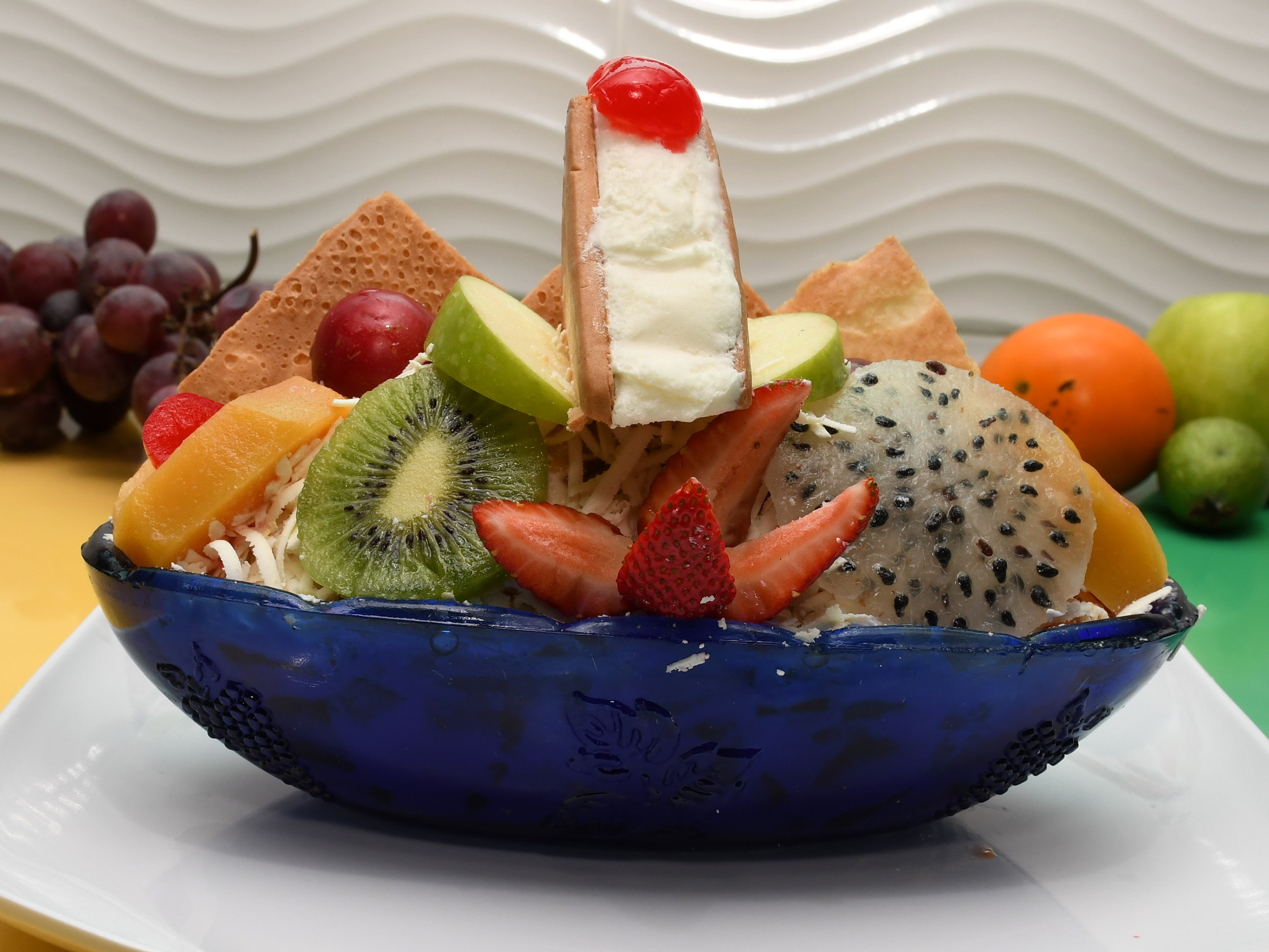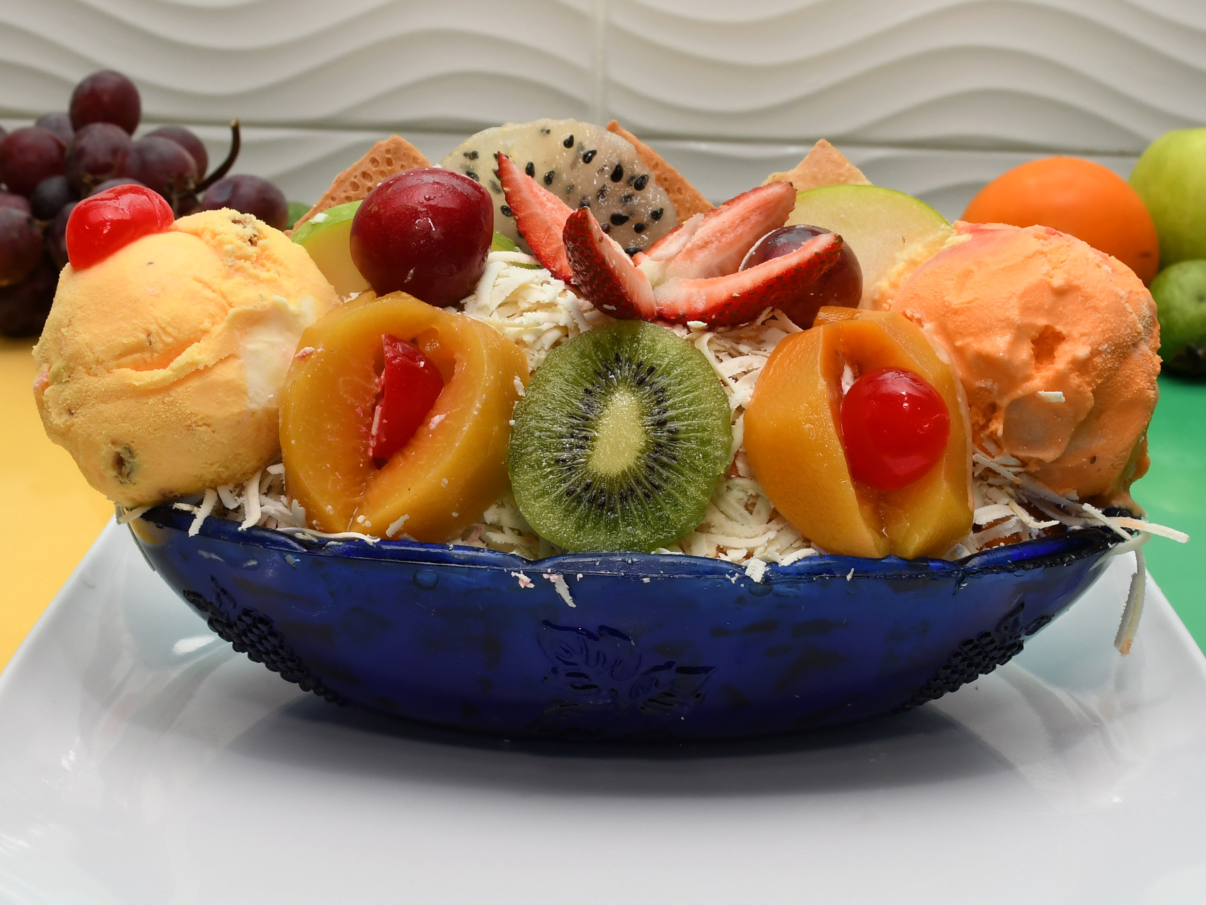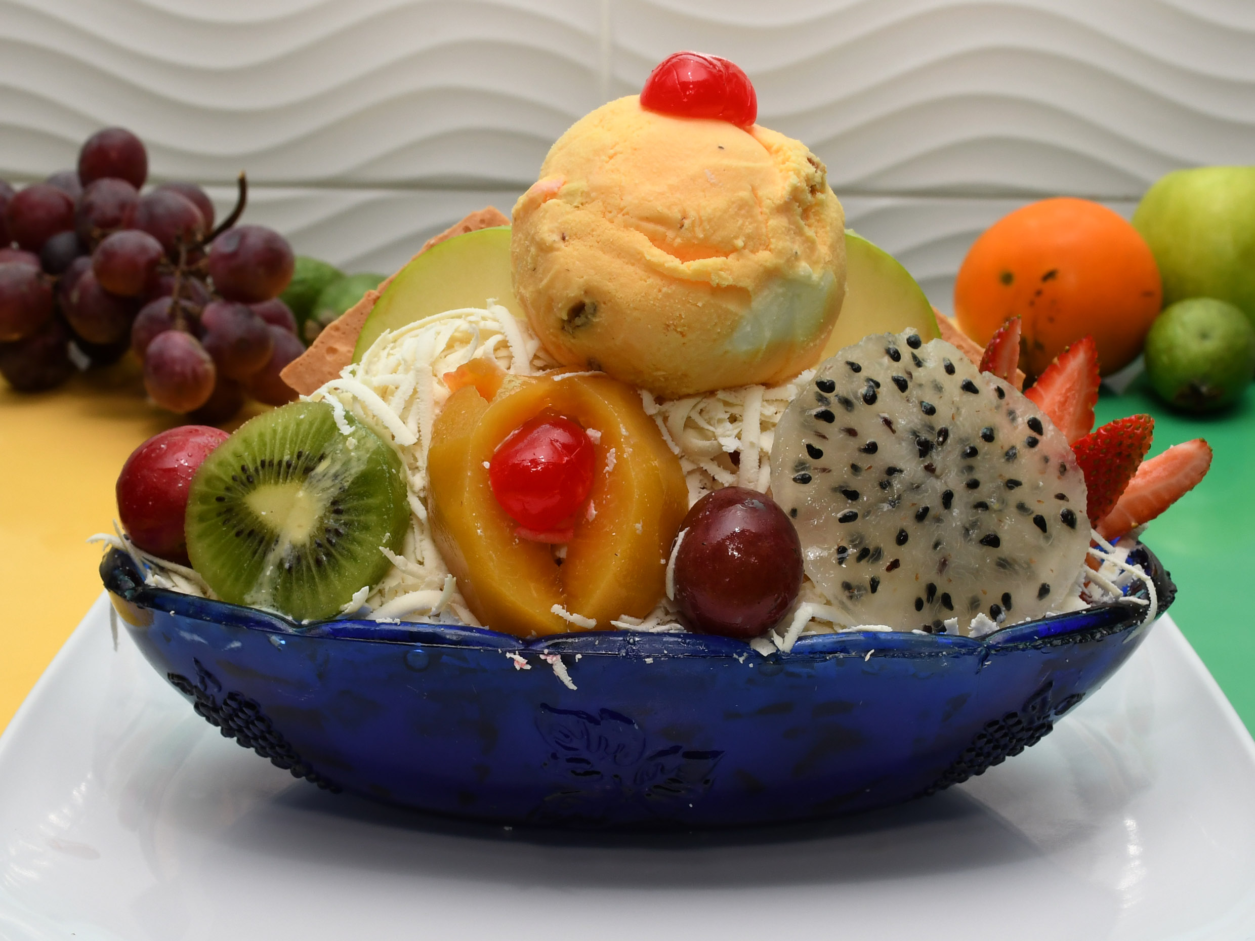 1 Porción de helado,frutas variada como: fresas, kiwi, pitaya, duraznos, manzanas, cerezas, queso, crema de leche y porción de frutas.