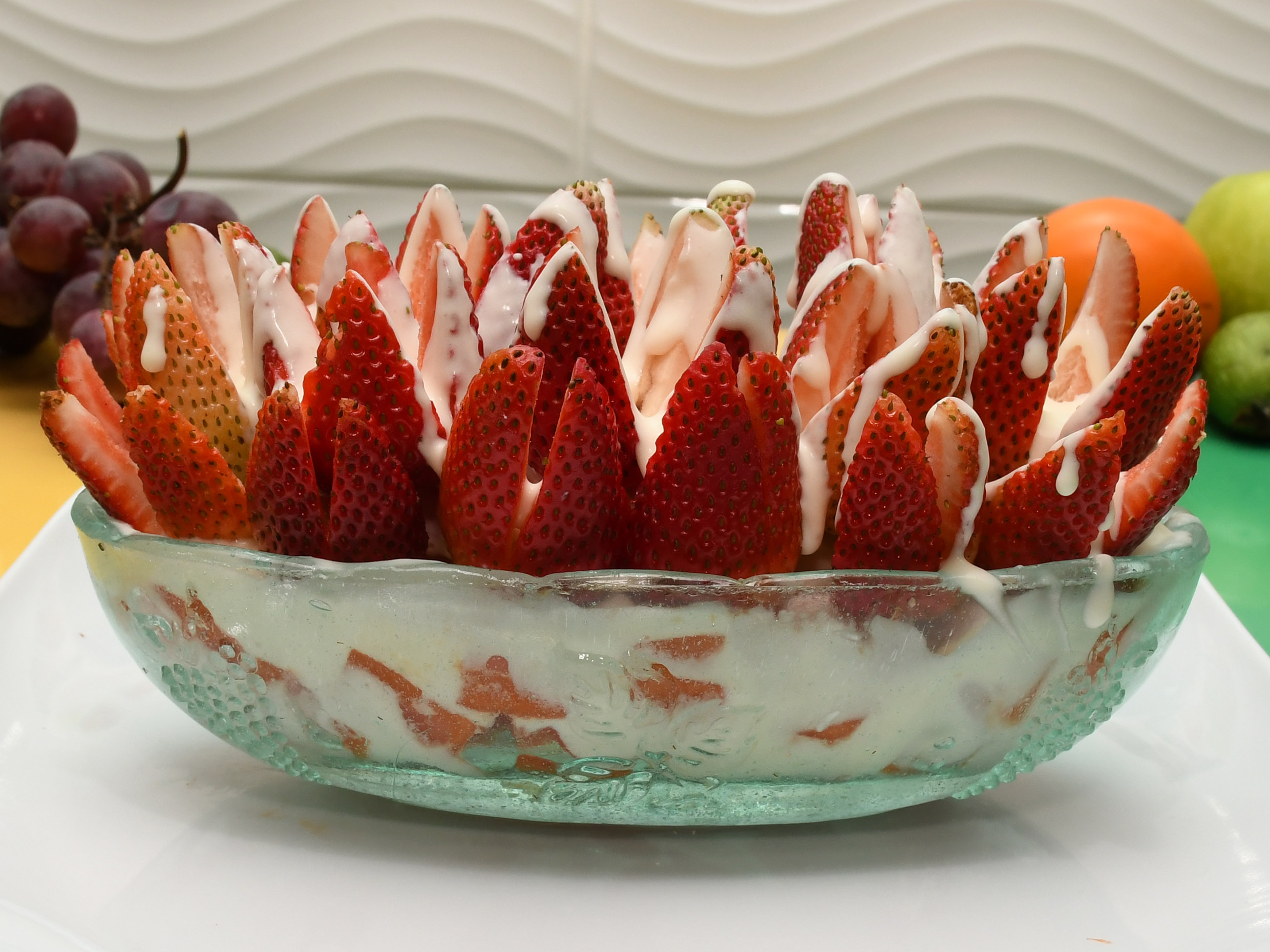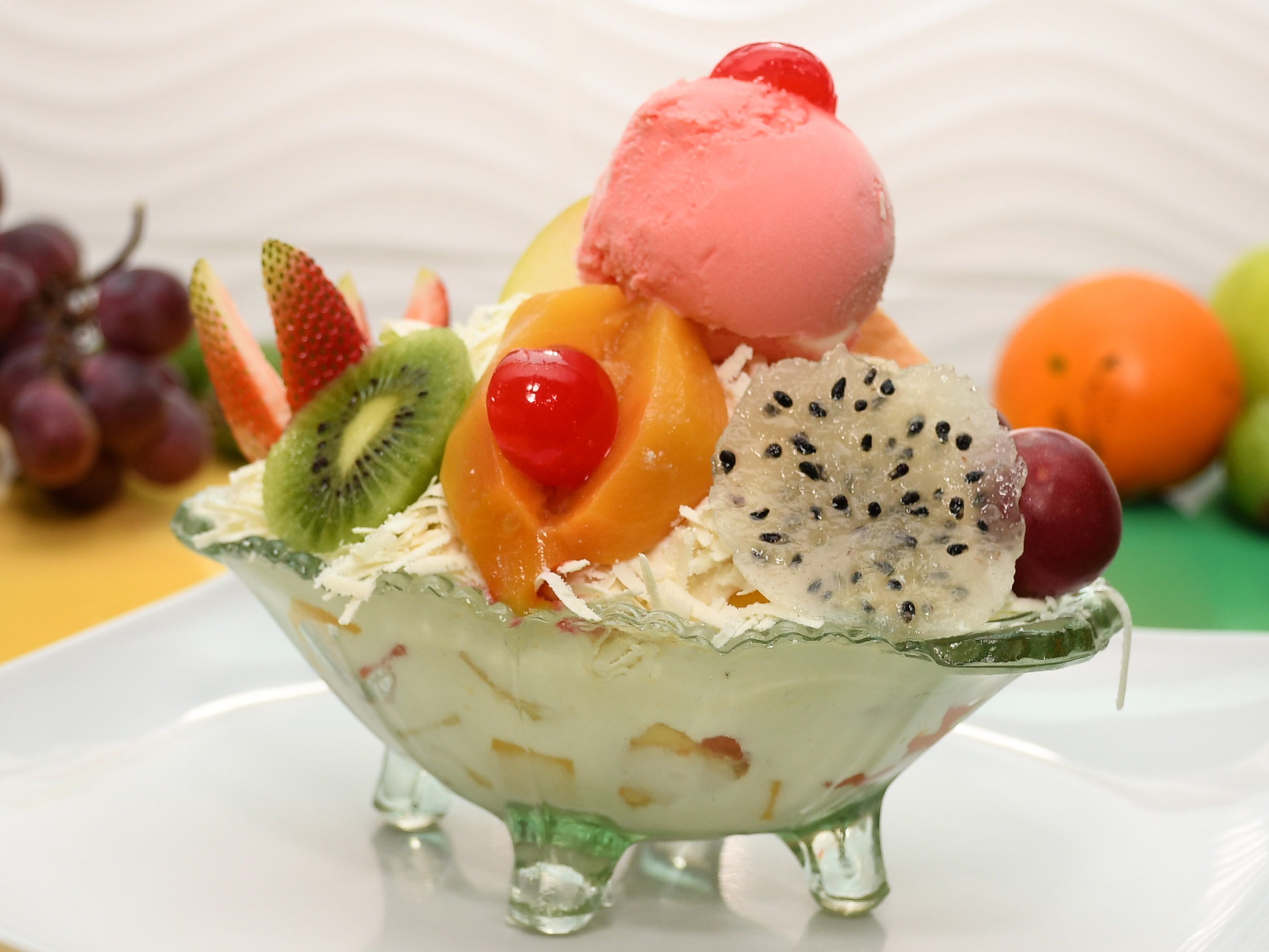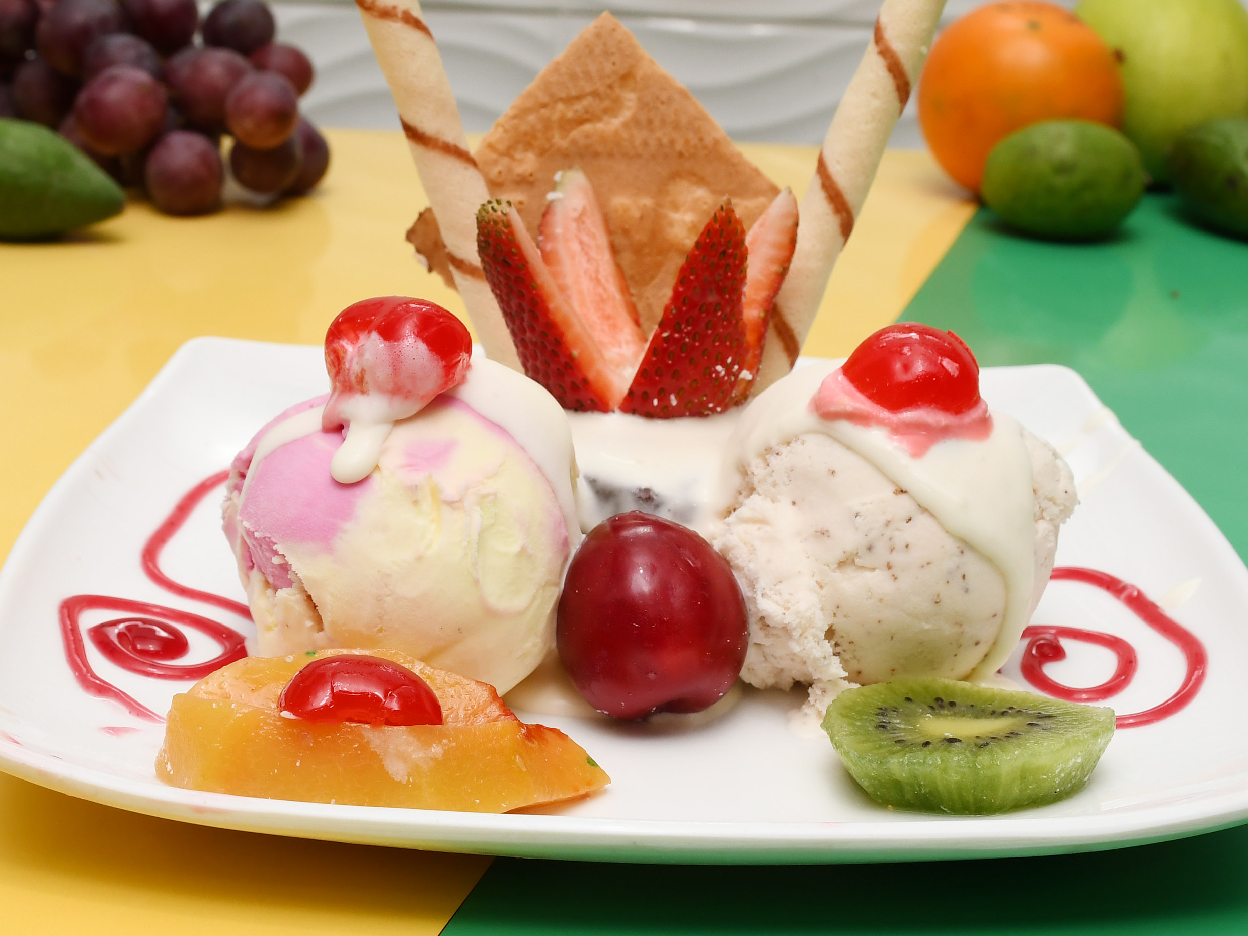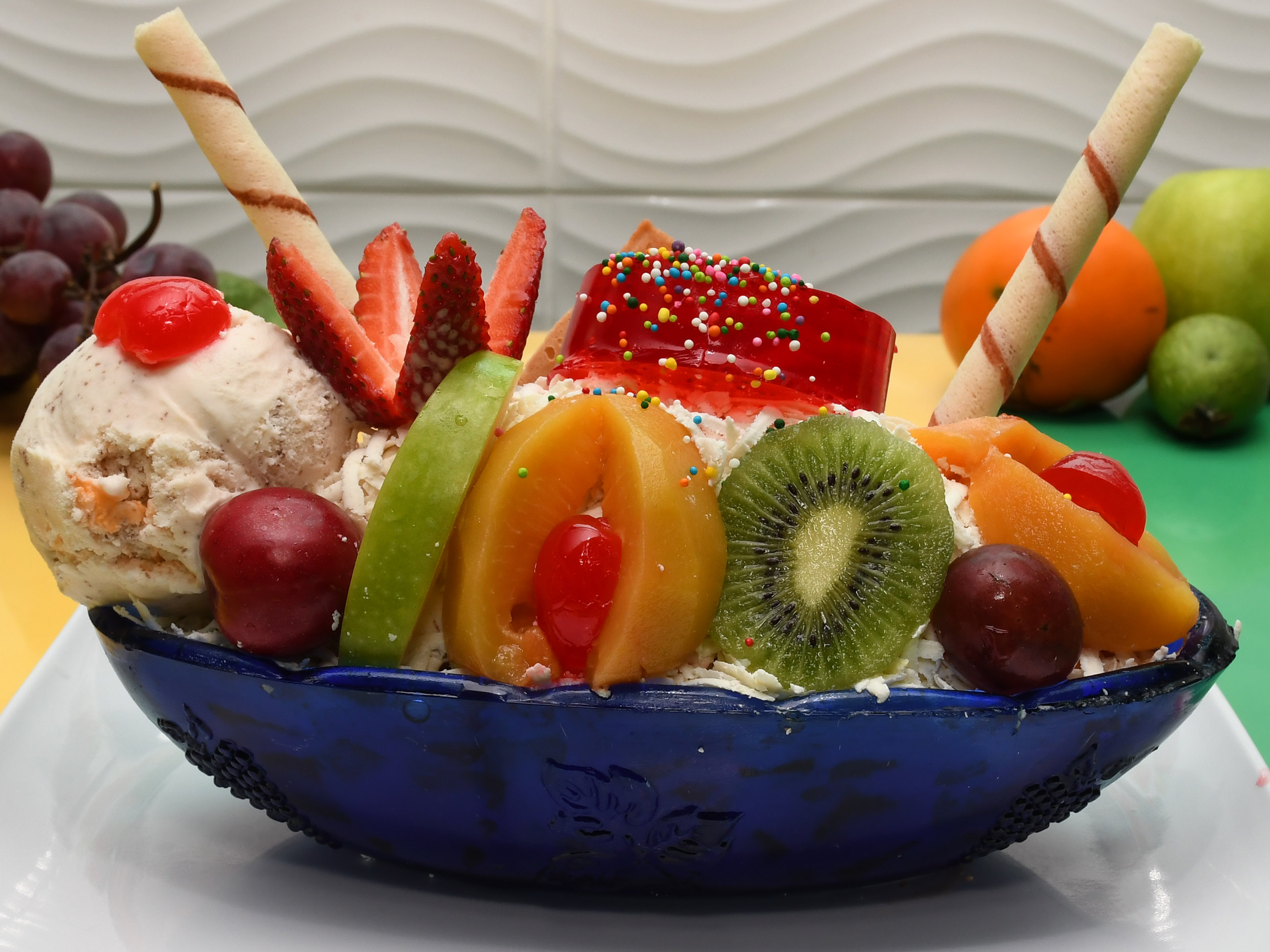 1 Porción de helado,frutas variada como: fresas, kiwi, pitaya, duraznos, manzanas, cerezas, queso, crema de leche y porción de frutas.