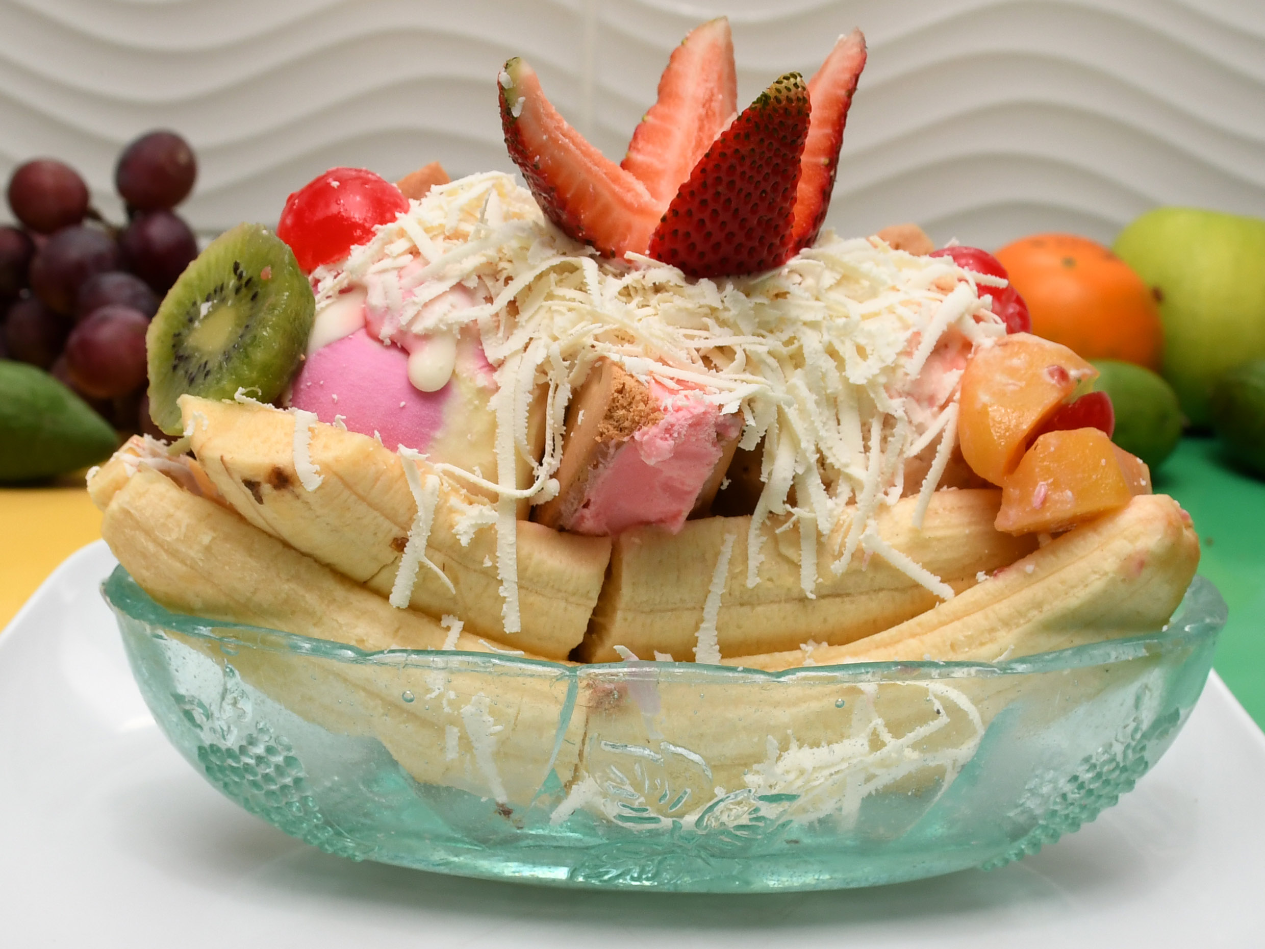 Base de banano entero acompañado con tres bolas de helado, fresa, chocolate y vainilla, crema chantillí, con barquillos y salsa de chocolate y cerezas.