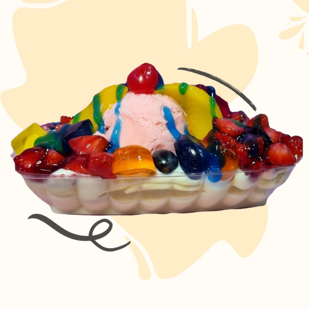 Banana (150 g), crema de la casa, 1 salsa a elección, queso, cereza, fresa en almíbar, 1 helado a elección, gelatina.