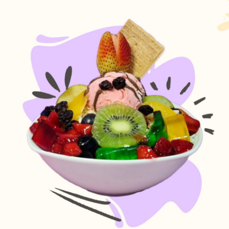 Papaya (100 g), mango (100 g), banano (100 g), crema de la casa, queso, fresa en almibar, helado a elección, manzana, cereza, kiwi, uva Isabelina, gelatina, galleta, 1 salsa a elección,