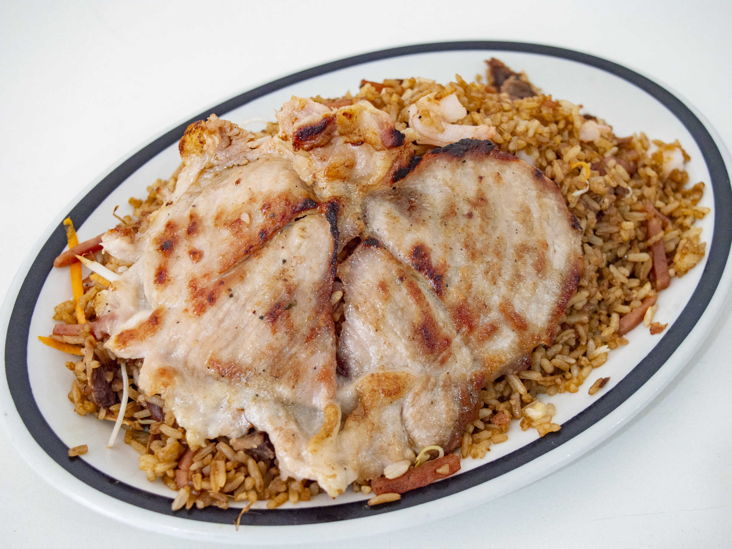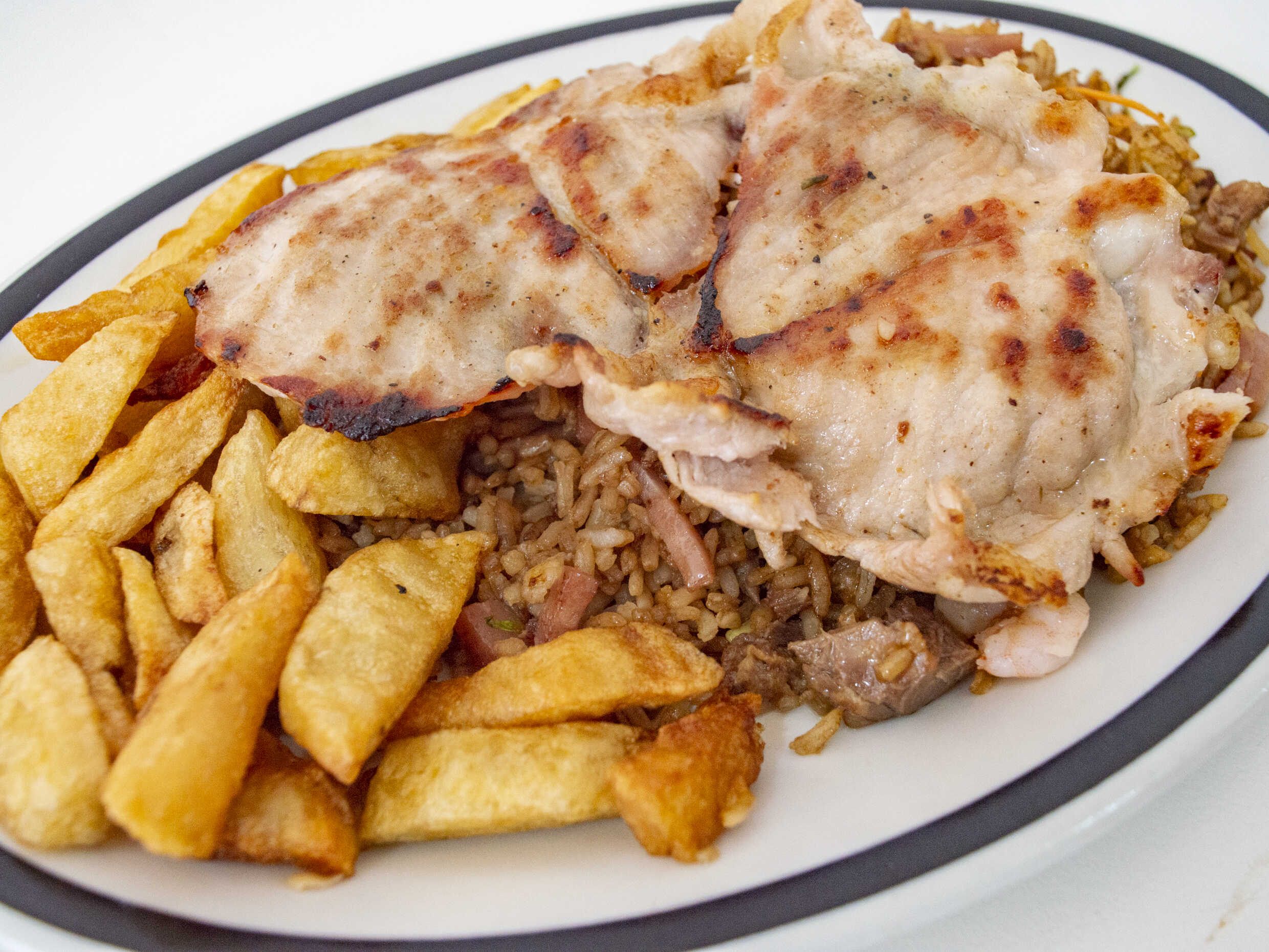 Arroz chino con carné, jamón, camarónes y raíces chinas , chuleta a la plancha