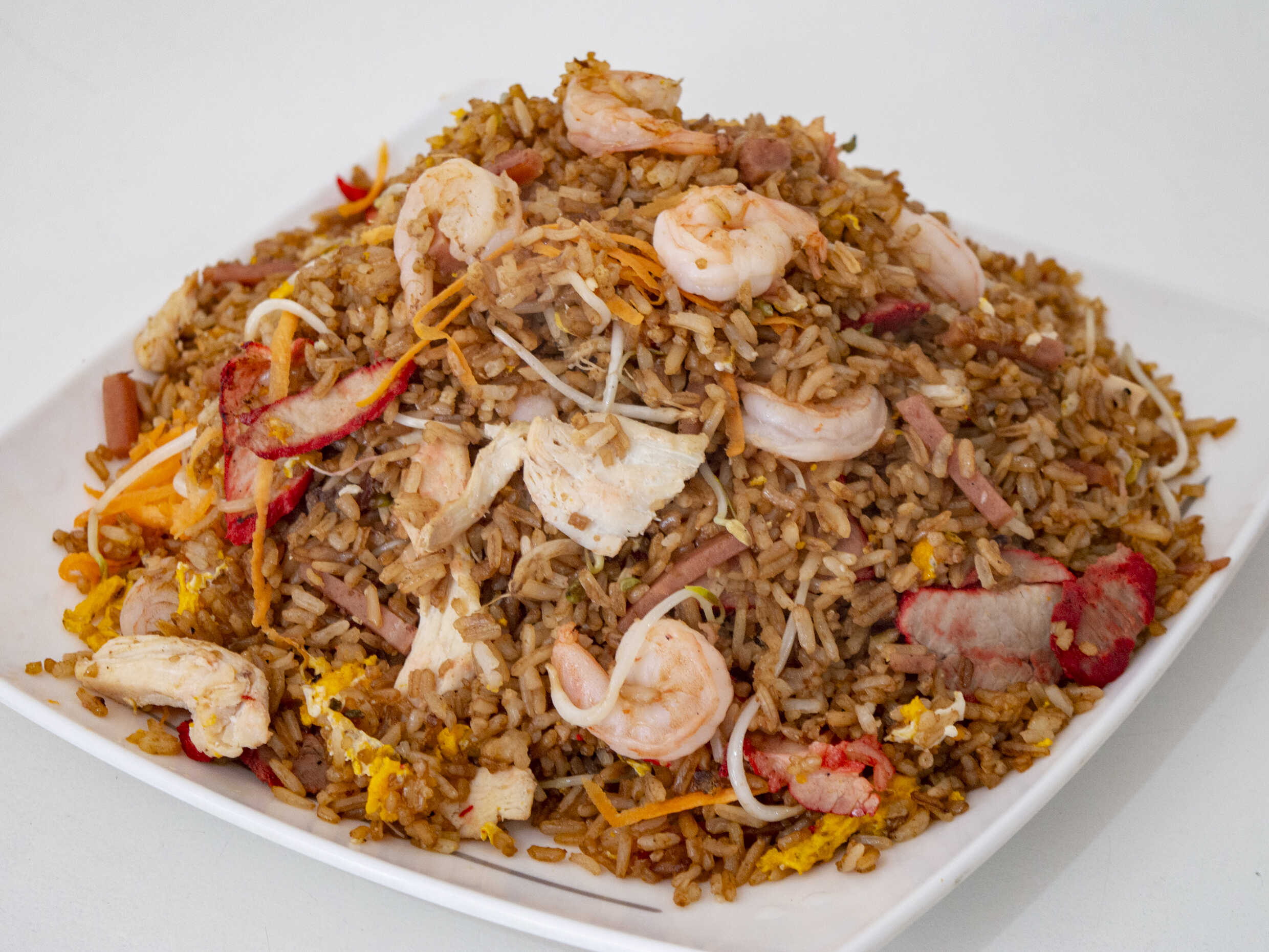 (3-4 personas) arroz chino con camarones,cerdo,pollo desmenuzado, jamón,huevo batito, raíces chinas
