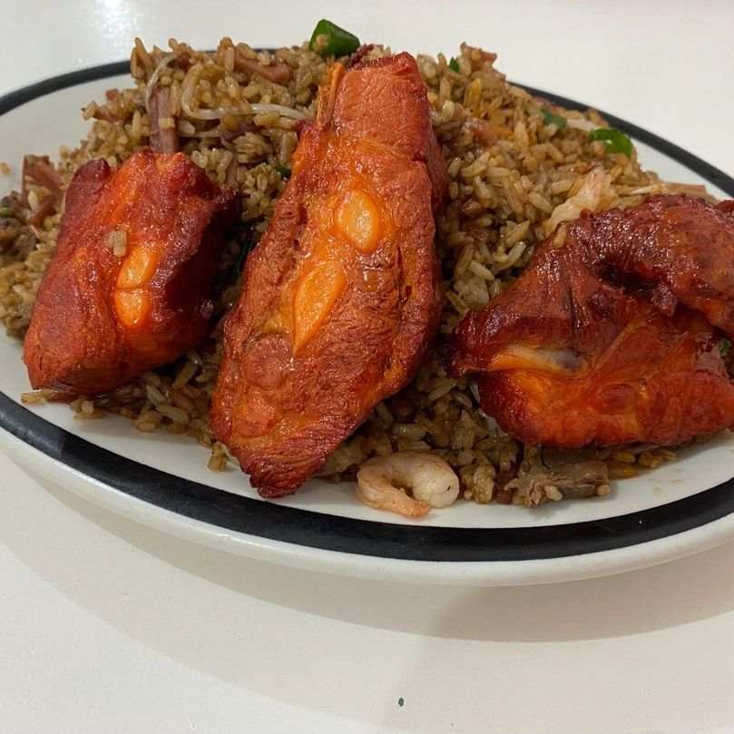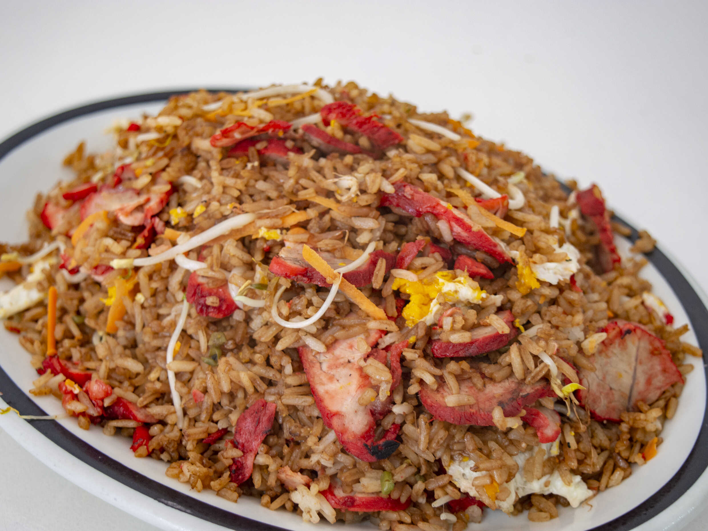 Arroz chino frito con Cerdo asado, huevo batito y raíces chinas