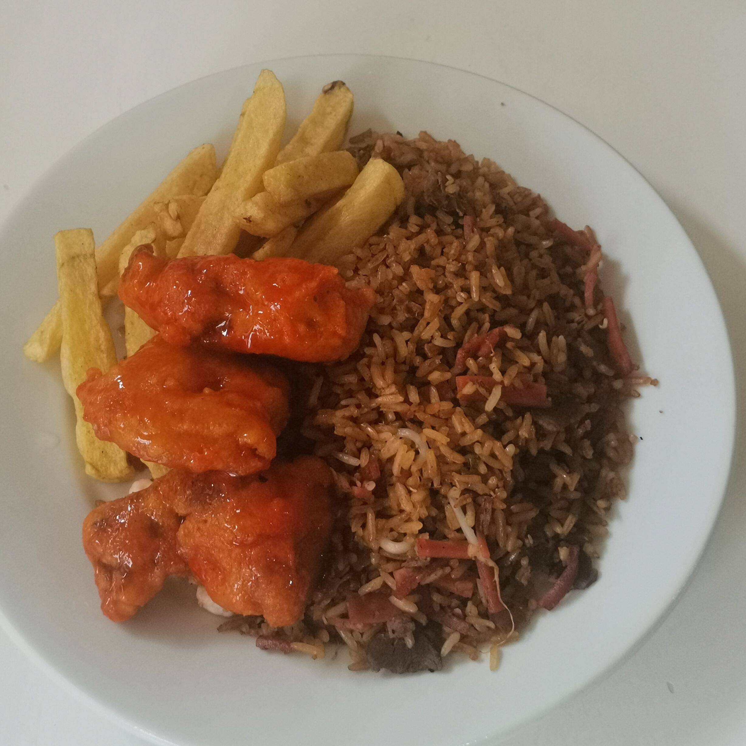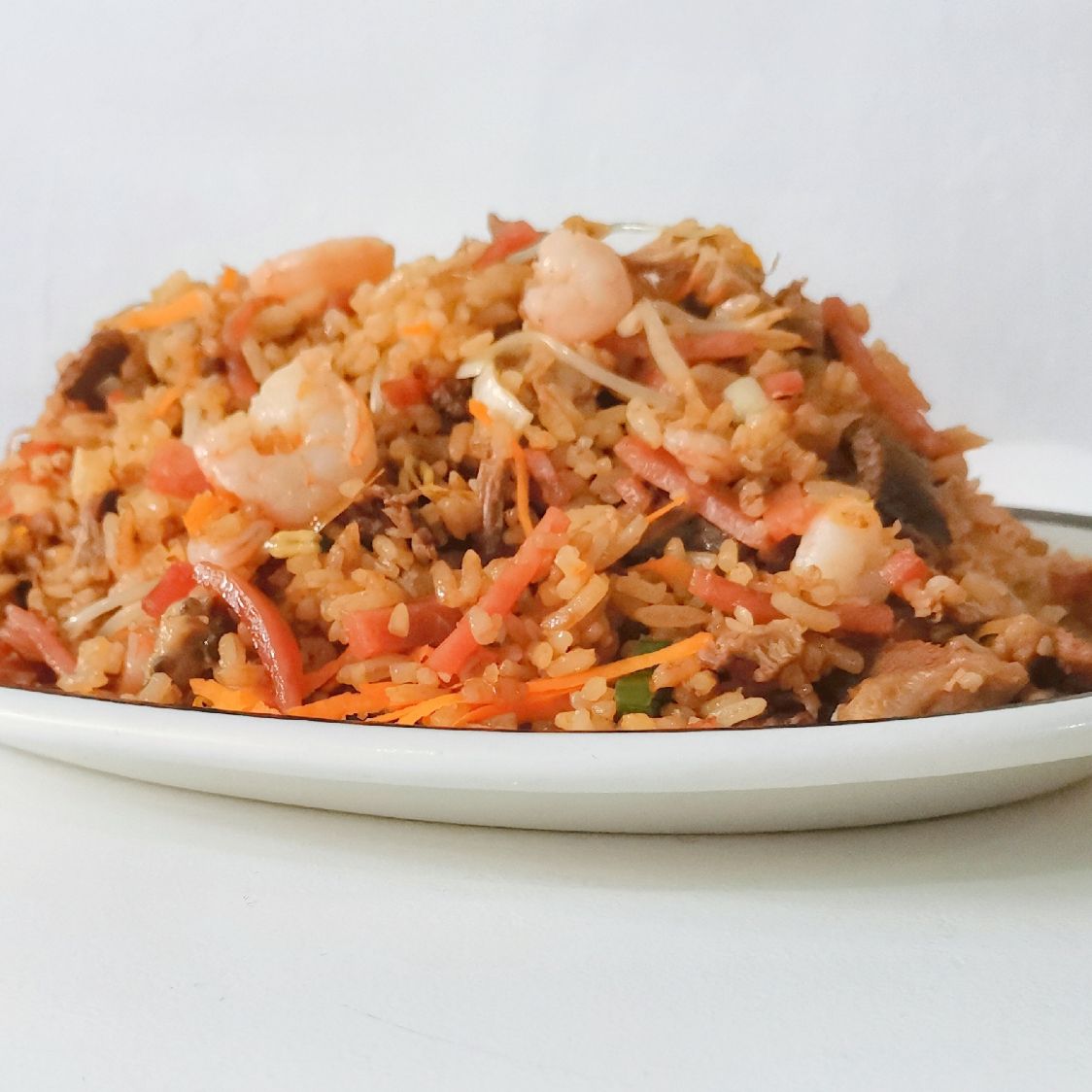 Porción de arroz chino con carne, jamón, camarón, raíces Chinas, papás,pollo agridulce