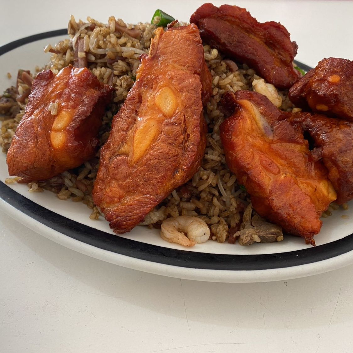 (2 personas ) arroz chino con carné, jamón, camarónes, raíces china, 200gr costilla de cerdo ahumado