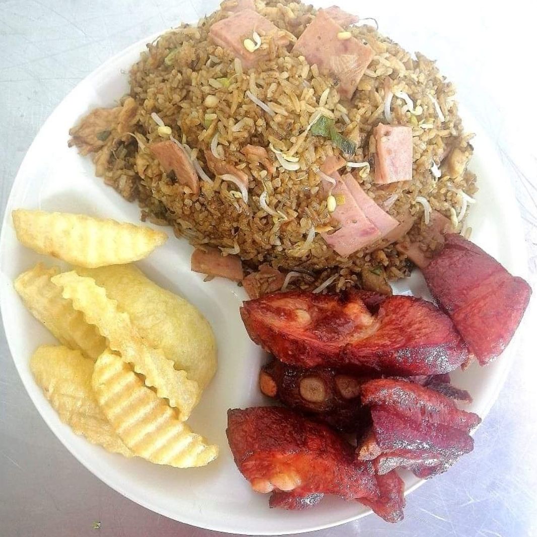 Arroz mixto (carné, jamón, camarón), raíces china,200gr costilla de cerdo,papas a la francesa
