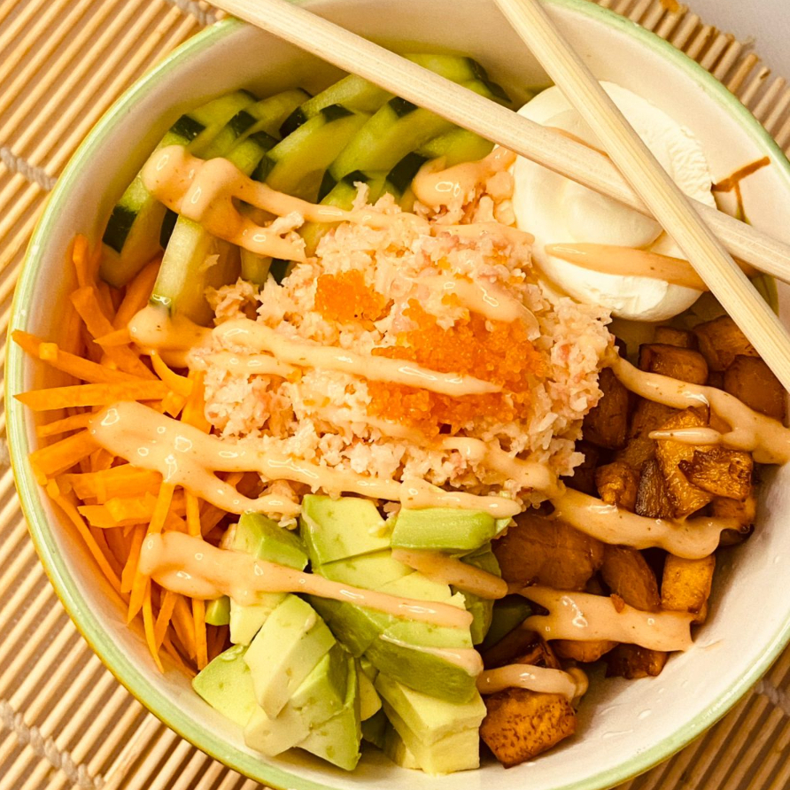 Base de arroz de sushi, zanahoria, pepino, aguacate, plátano, queso crema, palmito y massago con salsa mayosiracha .