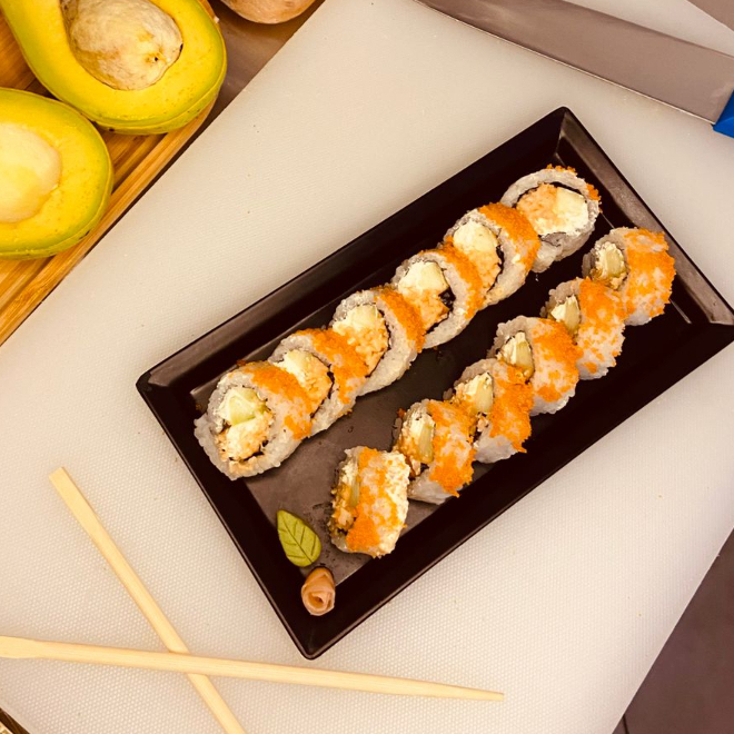 Arroz de sushi, Alga Nori, Salmon fresco, mezcla de palmito con camarones y mayosiracha , aguacate, queso crema y topping de ajonjolís acompañado de salsa teriyaki y soya