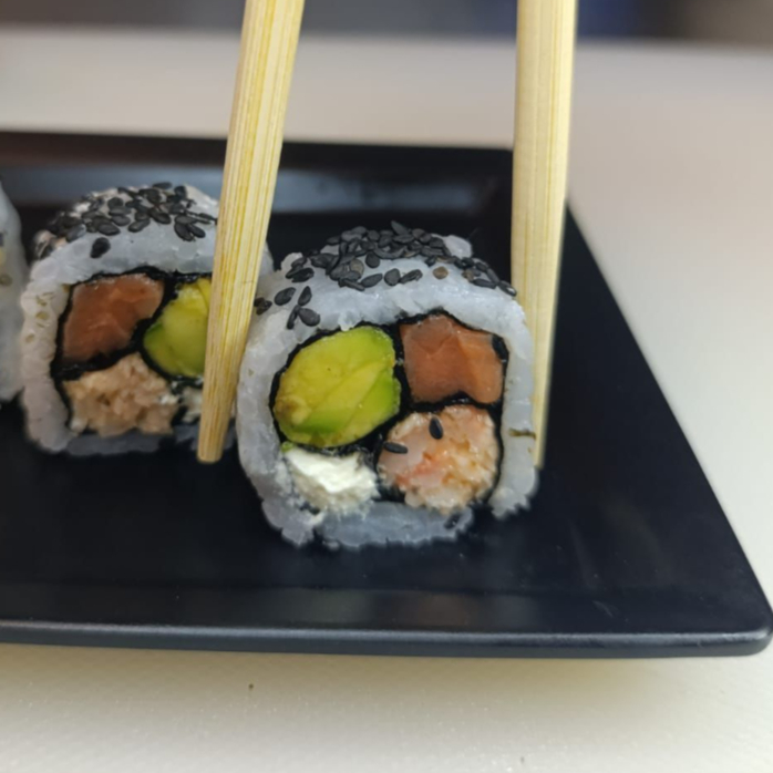 Alga nori, arroz de sushi, salmón fresco, queso crema, aguacate y ajonjolí tostados acompañado de salsa yosa y teriyaki