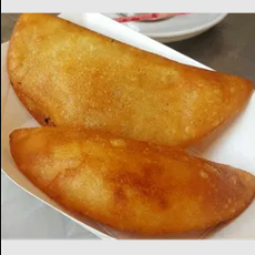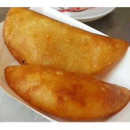 Empanada grande rellena de carne desmechada, caraotas, plátano maduro frito y queso blanco.