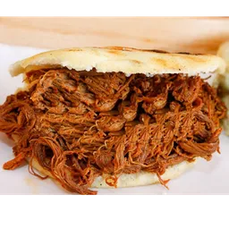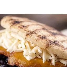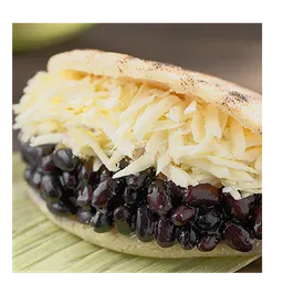 Arepa rellena de carne desmechada, platano maduro frito, caraotas y queso